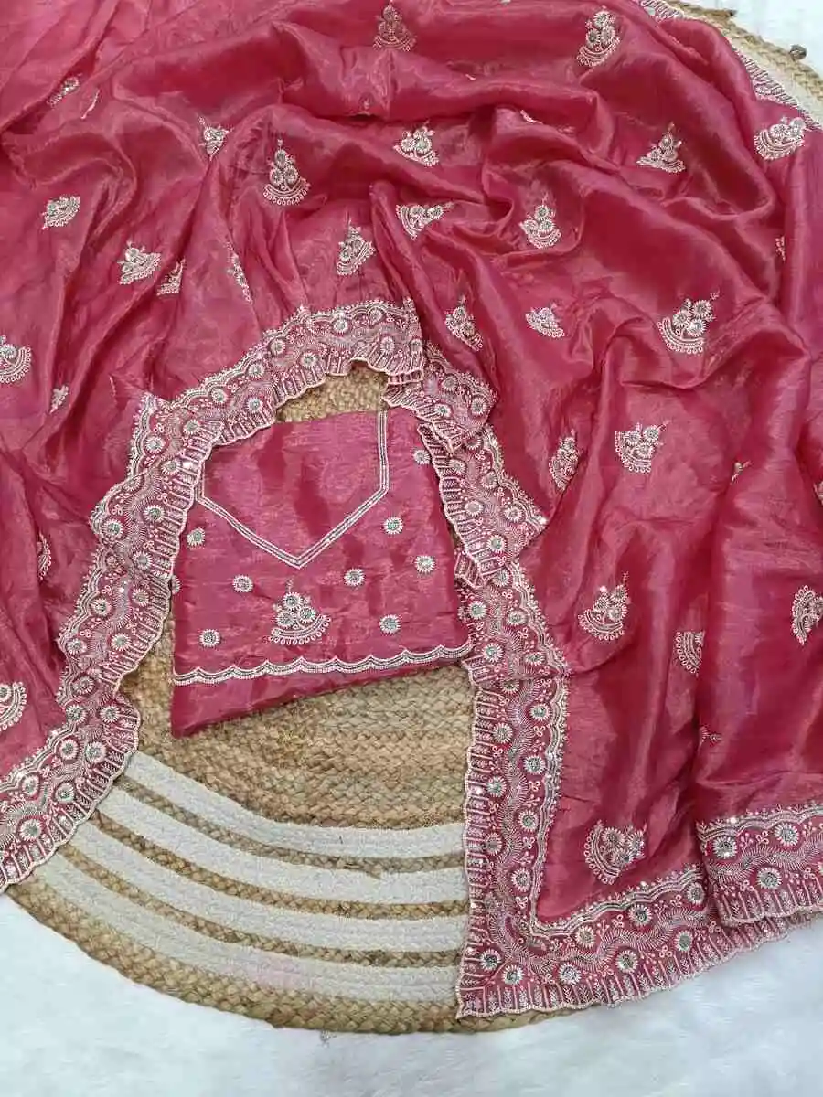 RICH LOOK GOLD CRUSH COTTON THREAD EMBROIDERY WITH SEQUENCE WORK SAREE WITH UNSTITCHED BLOUSE PINK