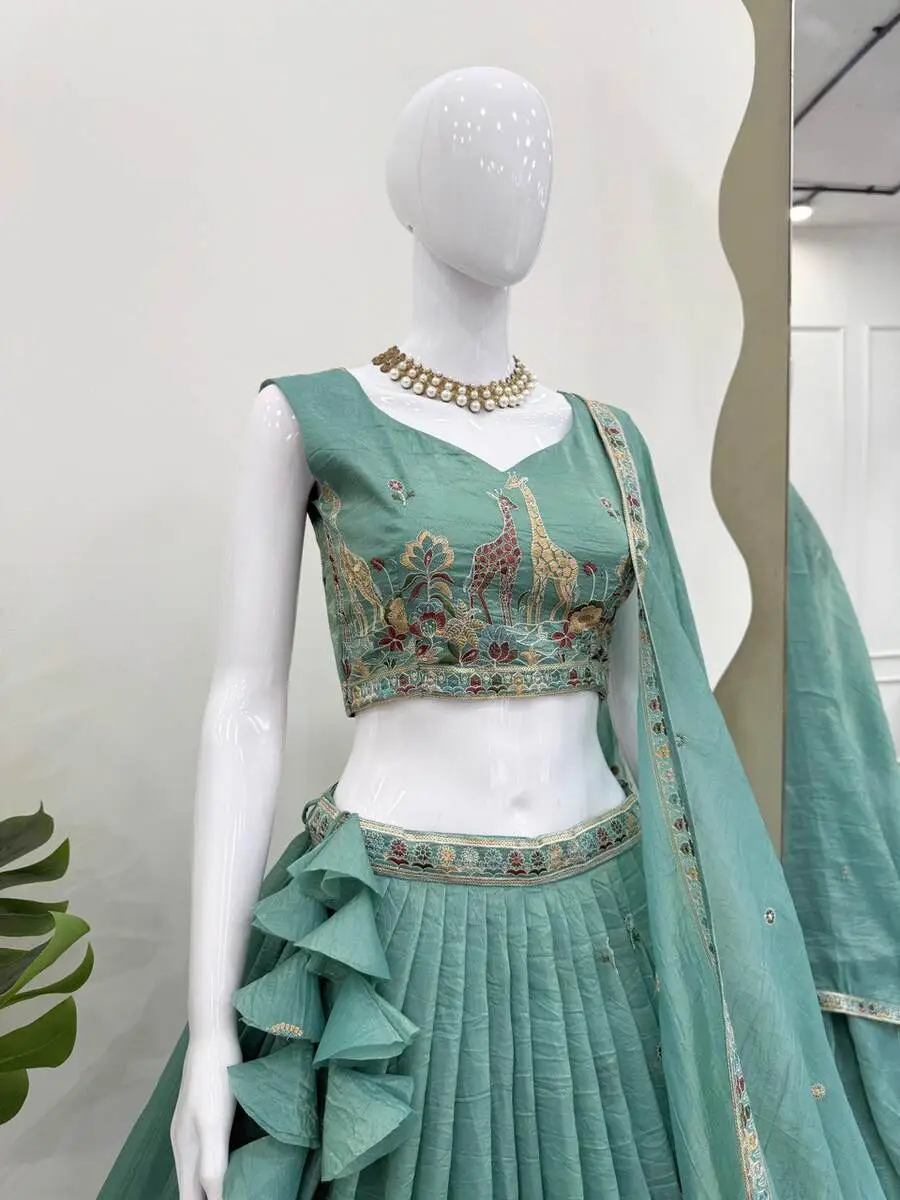 RICH LOOK GOLD CRUSH THREAD EMBROIDERY WITH SEQUENCE WORK LEHENGA UNSTITCHED CHOLI WITH DUPATTA MINT