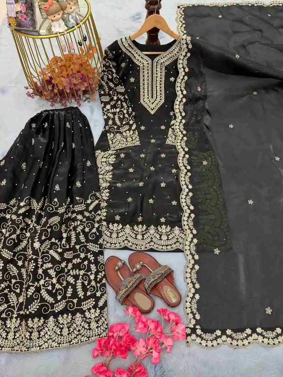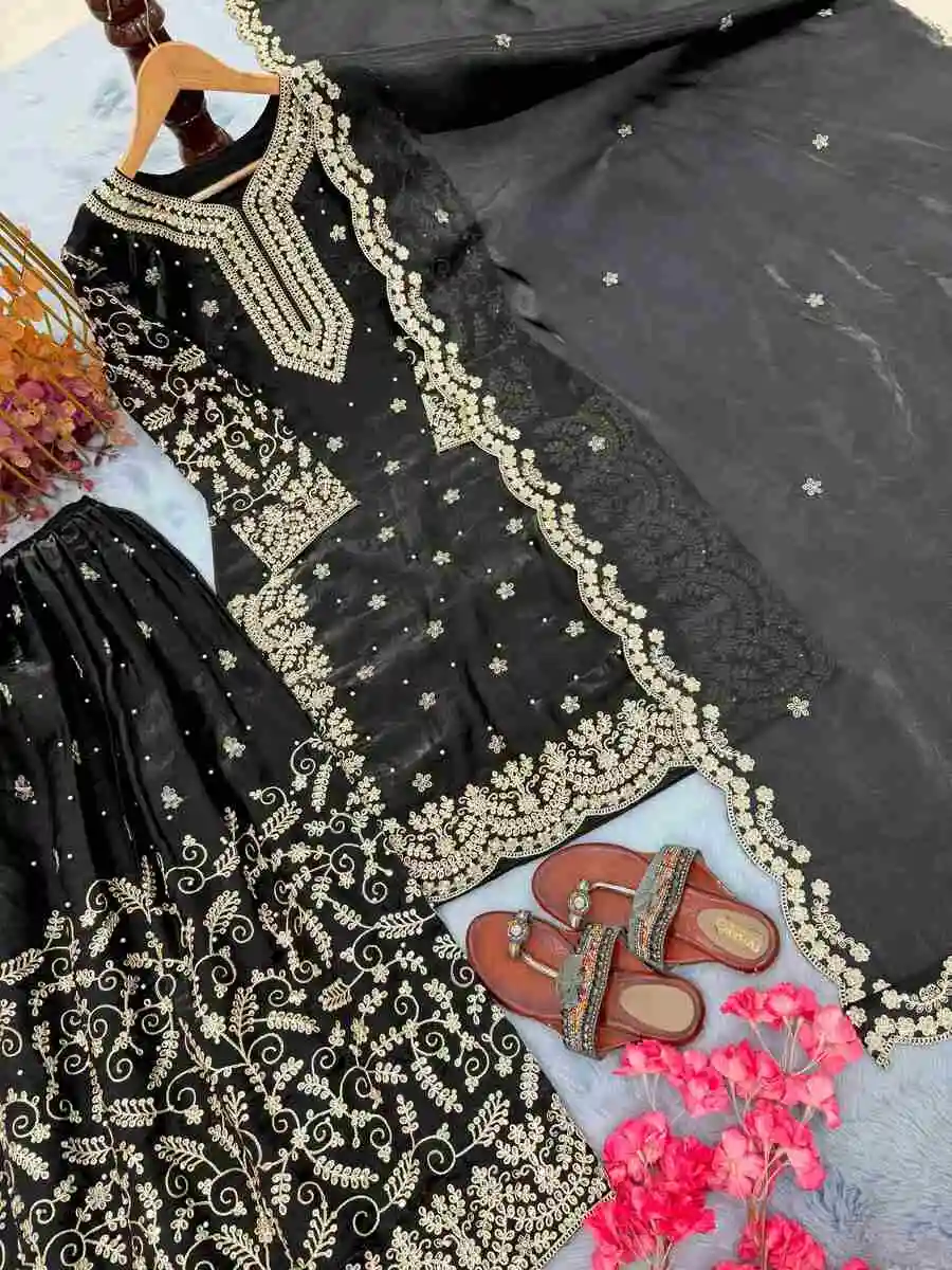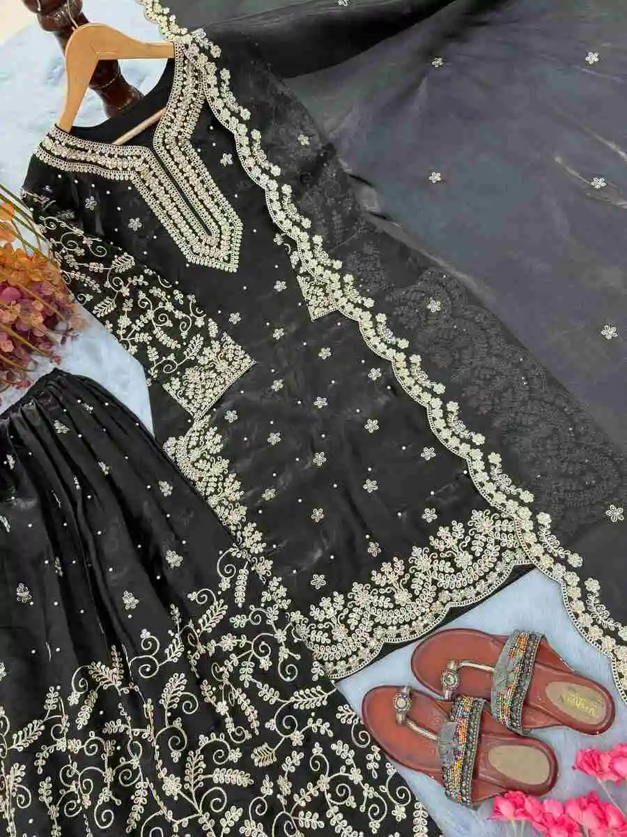RICH LOOK JIMMY CHOO EMBROIDERY 3MM SEQUENCE & CODING DORI WORK WITH MOTI HAND WORK TOP PALAZZO WITH DUPATTA BLACK