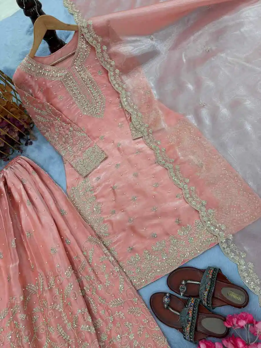 RICH LOOK JIMMY CHOO EMBROIDERY 3MM SEQUENCE & CODING DORI WORK WITH MOTI HAND WORK TOP PALAZZO WITH DUPATTA PEACH