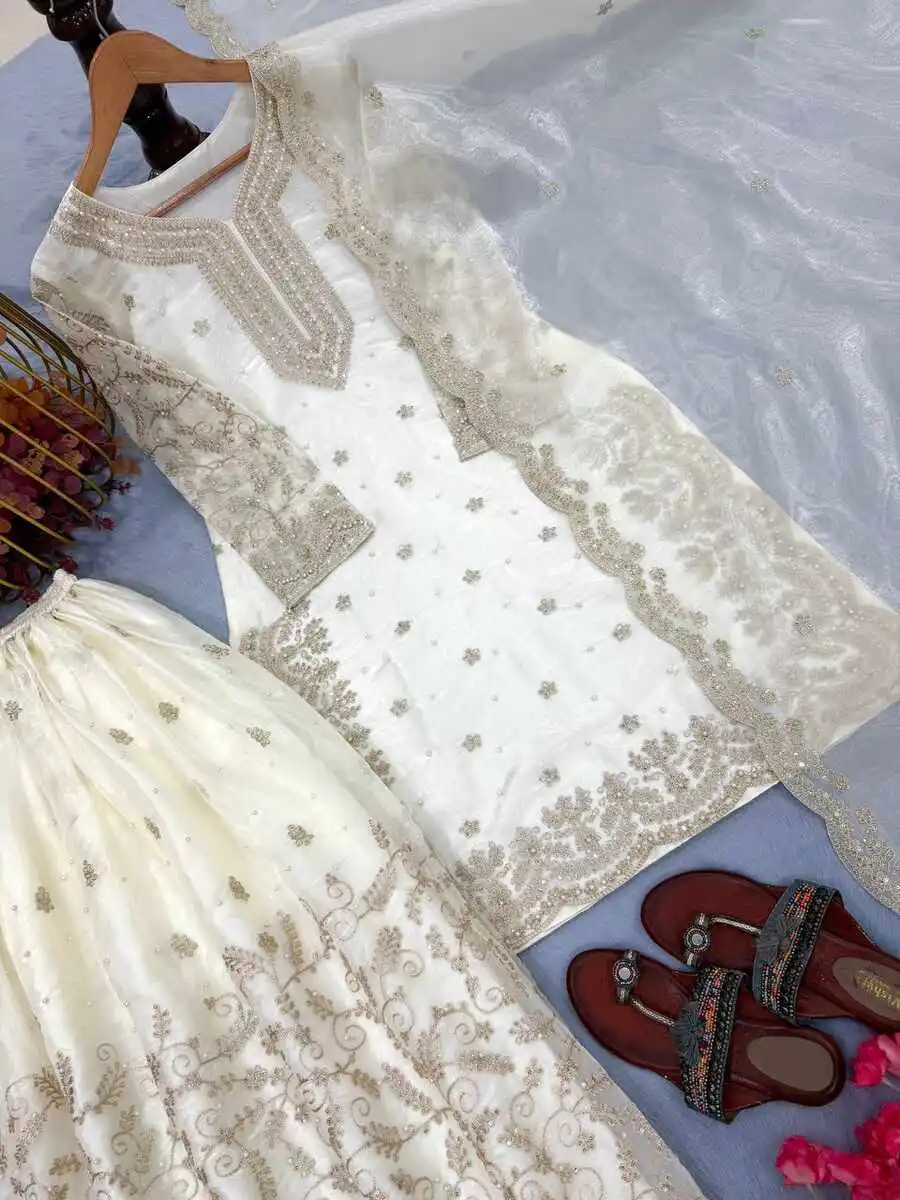 RICH LOOK JIMMY CHOO EMBROIDERY 3MM SEQUENCE & CODING DORI WORK WITH MOTI HAND WORK TOP PALAZZO WITH DUPATTA WHITE