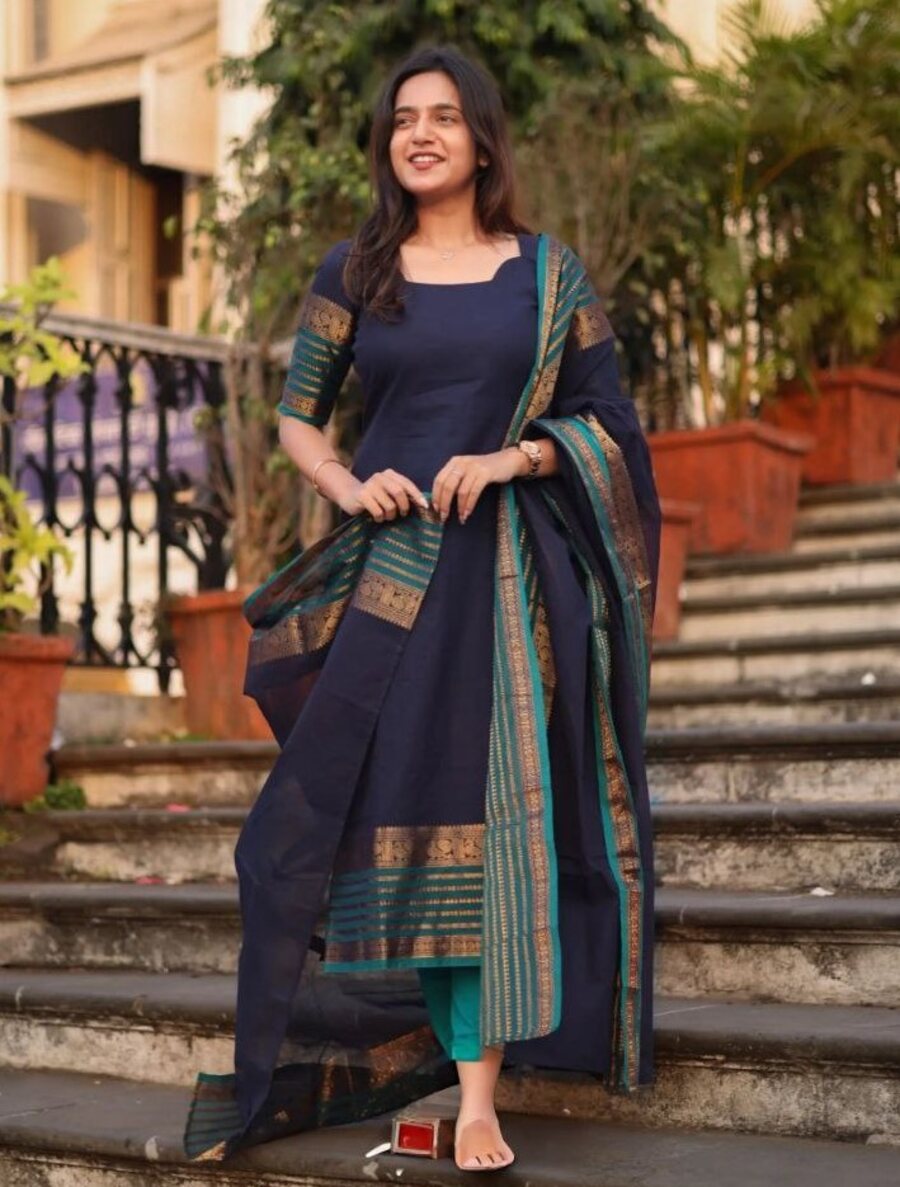 RICH LOOK KANCHI COTTON JACQUARD WEAVING WORK TOP WITH DUPATTA NAVY BLUE