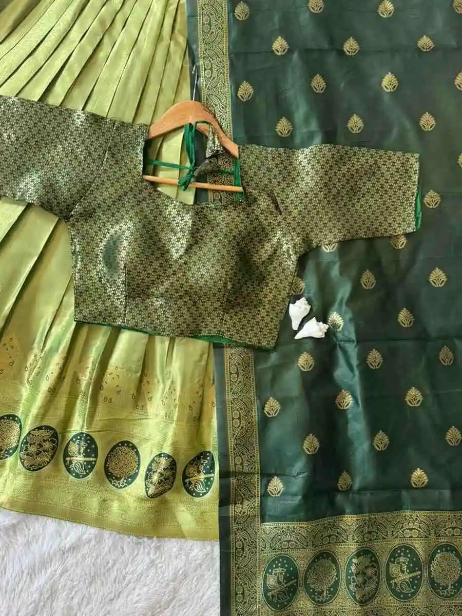 RICH LOOK KANJIVARAM SILK ZARI WEAVING WORK STITCHED LEHENGA UNSTITCHED CHOLI WITH DUPATTA GREEN AND PISTA