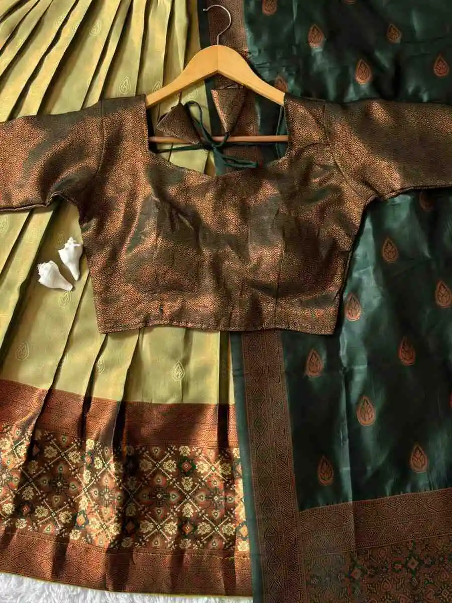 RICH LOOK KANJIVARAM SILK ZARI WEAVING WORK STITCHED LEHENGA UNSTITCHED CHOLI WITH DUPATTA PISTA AND GREEN