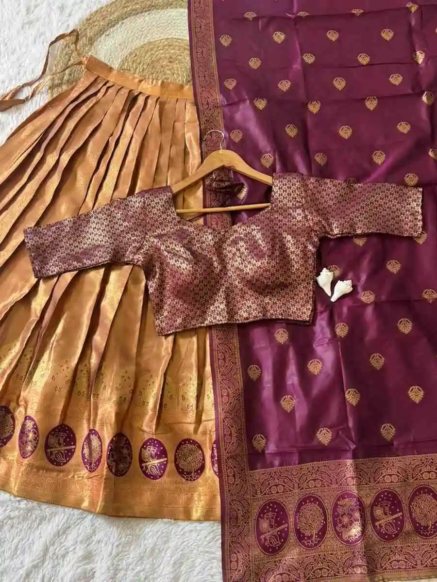 RICH LOOK KANJIVARAM SILK ZARI WEAVING WORK STITCHED LEHENGA UNSTITCHED CHOLI WITH DUPATTA WINE AND YELLOW