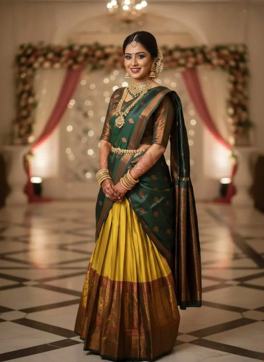 RICH LOOK KANJIVARAM SILK ZARI WEAVING WORK STITCHED LEHENGA UNSTITCHED CHOLI WITH DUPATTA YELLOW AND GREEN
