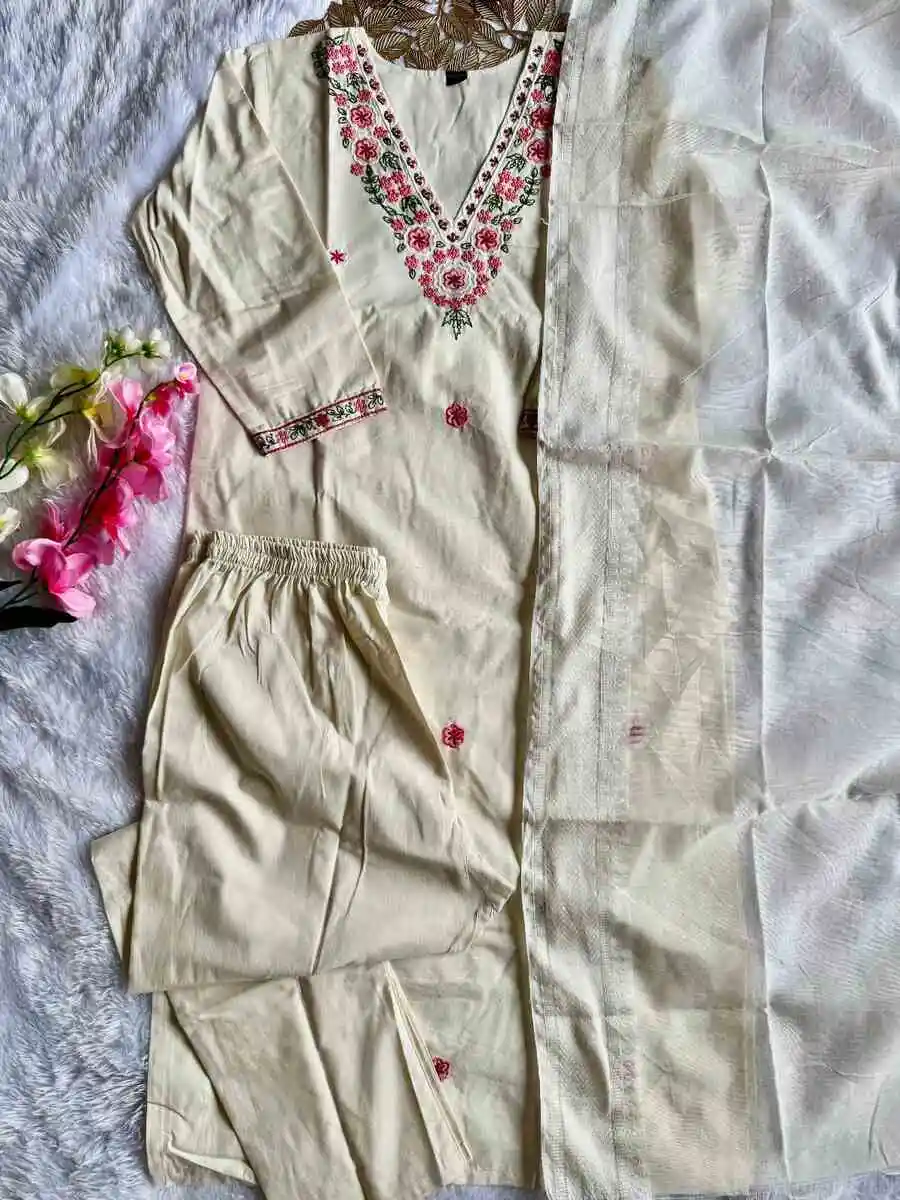 RICH LOOK KHADI COTTON EMBROIDERY WORK TOP BOTTOM WITH DUPATTA OFF WHITE