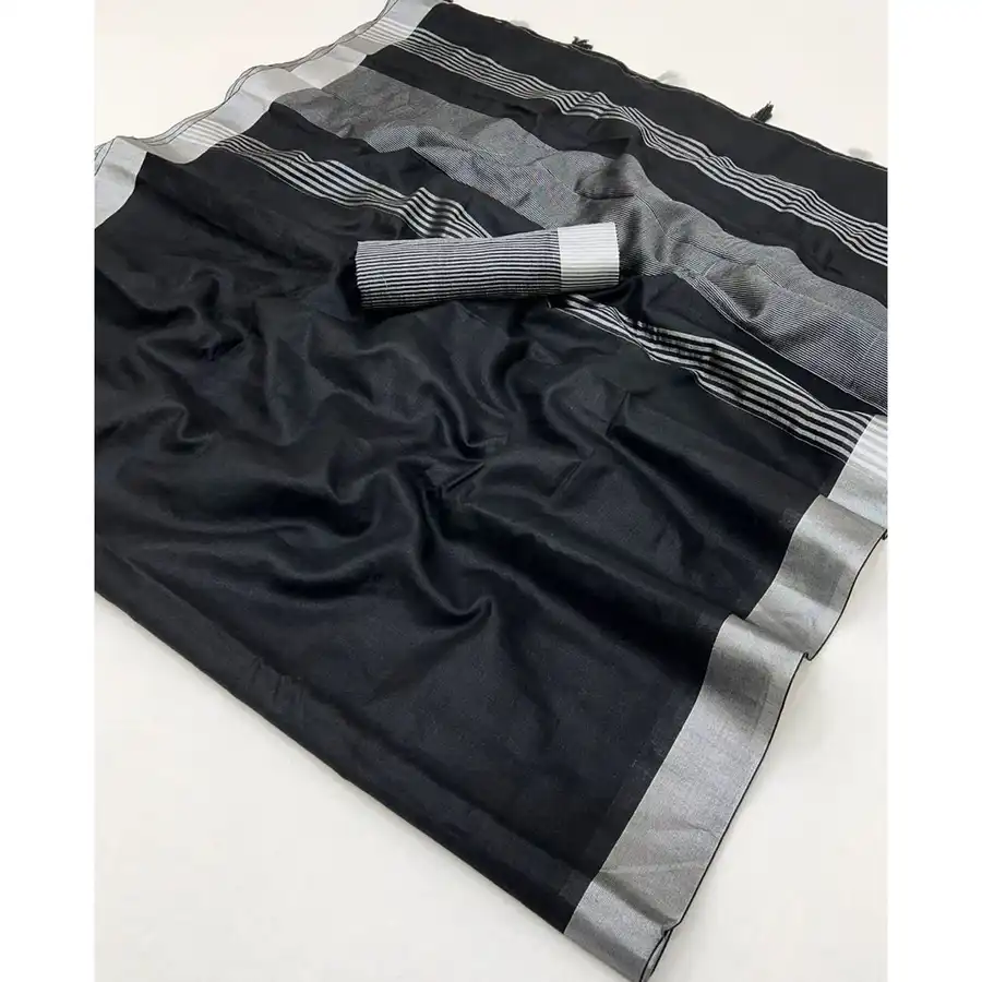 RICH LOOK LINEN COTTON PLAIN WITH EXTRA ZALAR WORK SAREE WITH UNSTITCHED BLOUSE BLACK
