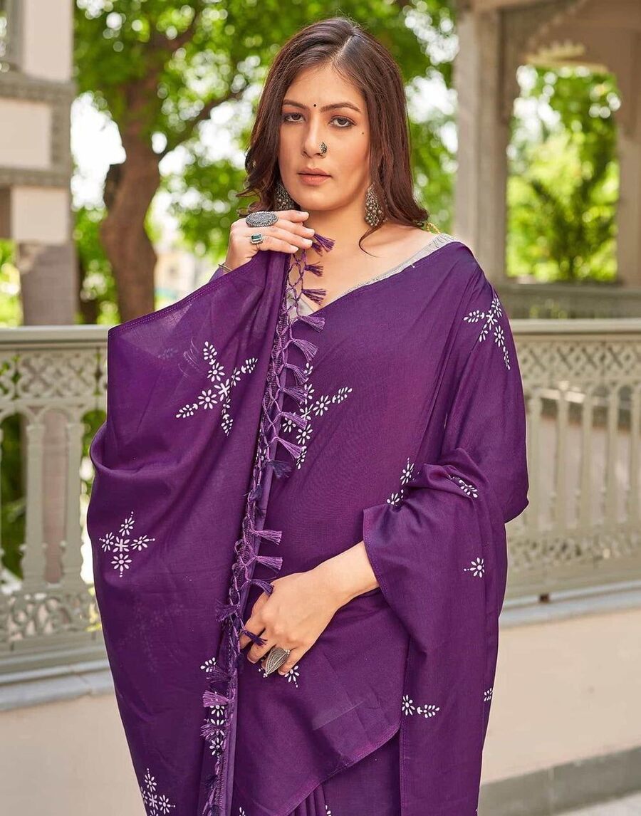 RICH LOOK MUSLIN COTTON SILK DIGITAL PRINT WORK SAREE WITH UNSTITCHED BLOUSE PURPLE