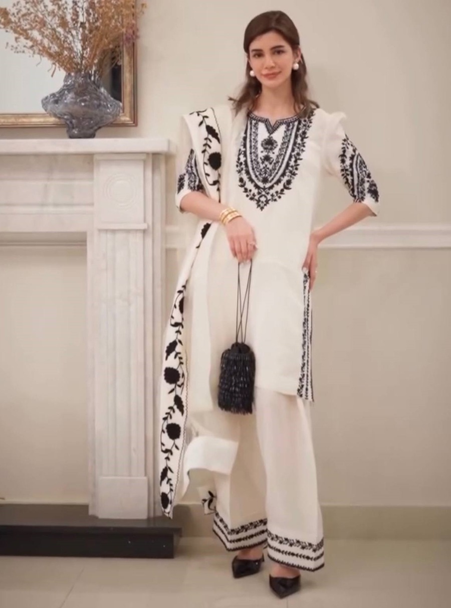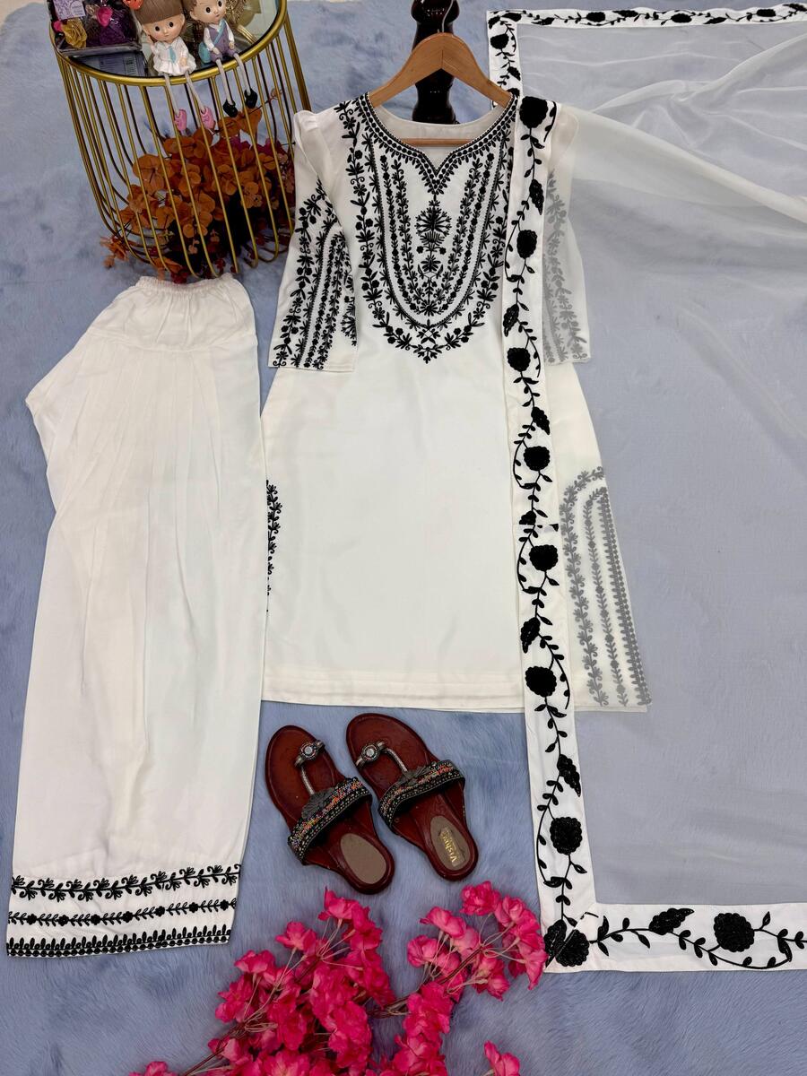 RICH LOOK NATURAL CREPE EMBROIDERY WORK TOP PATIYALA WITH DUPATTA WHITE