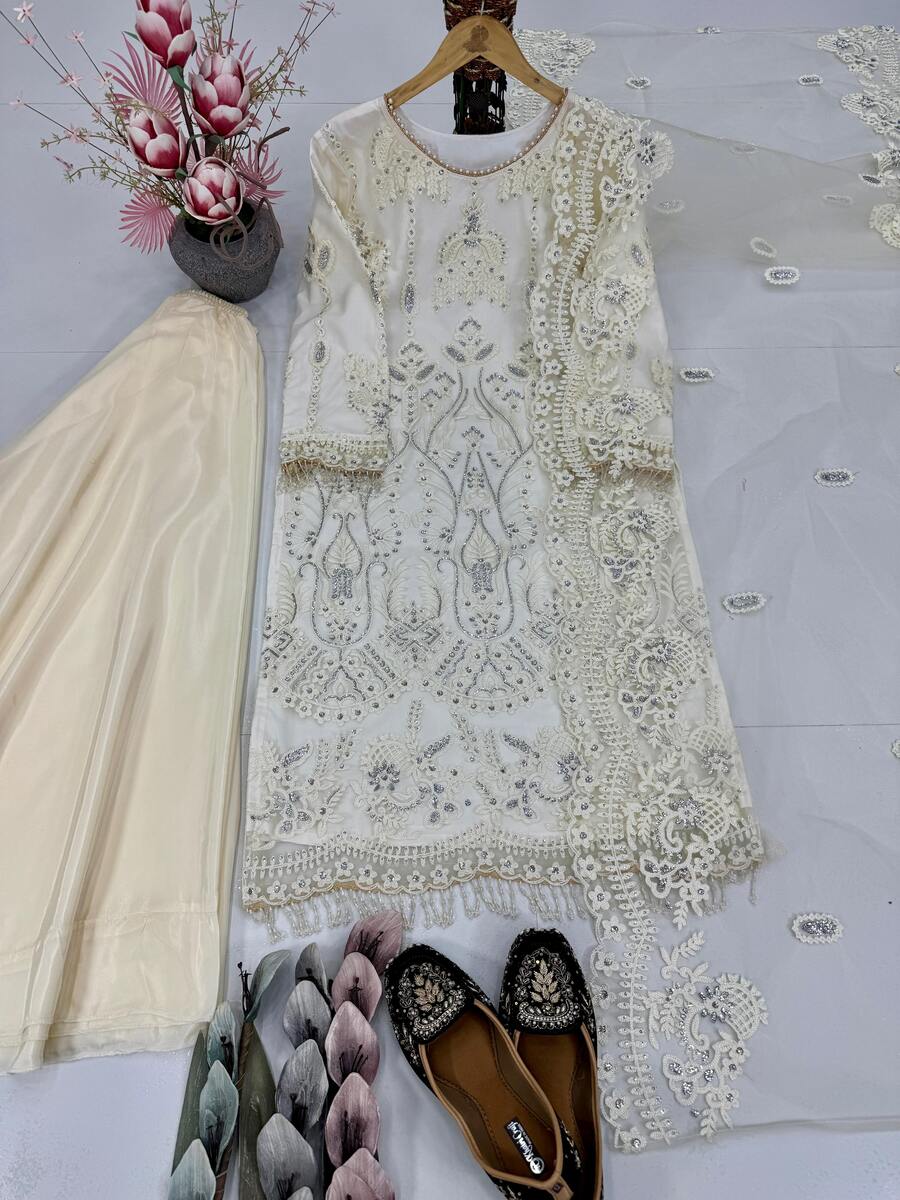 RICH LOOK NET EMBROIDERY CHAIN SEQUENCE WORK WITH FANCY LACE WORK TOP PALAZZO WITH DUPATTA OFF WHITE