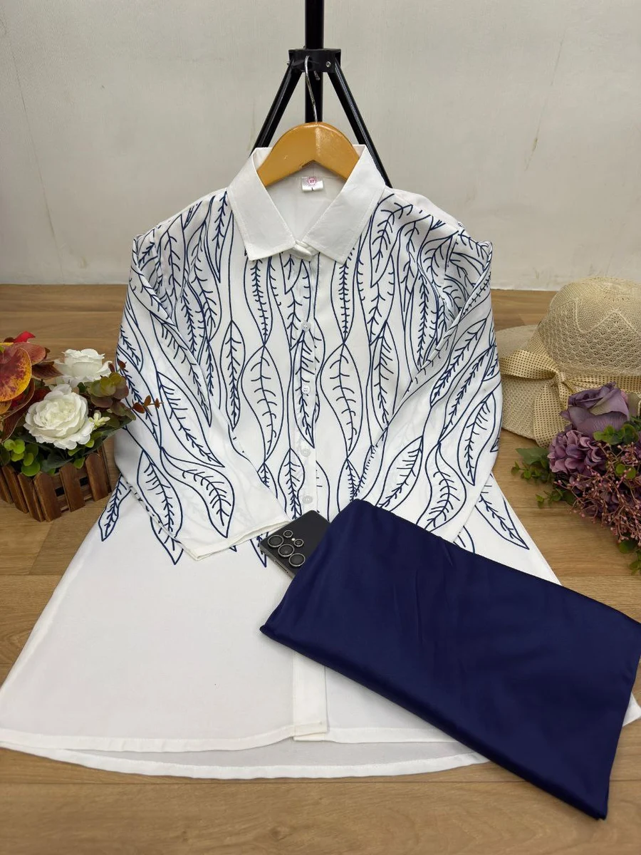 RICH LOOK POLY RAYON PRINTED WORK TOP PALAZZO SET NAVY BLUE