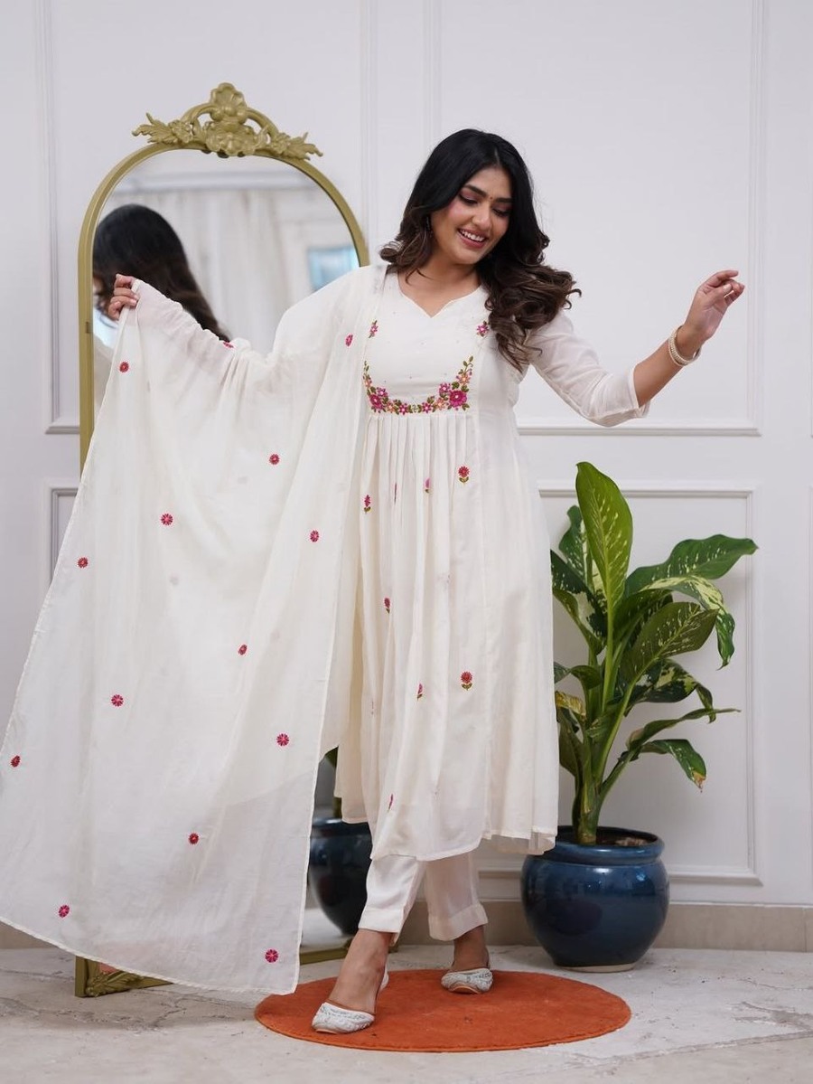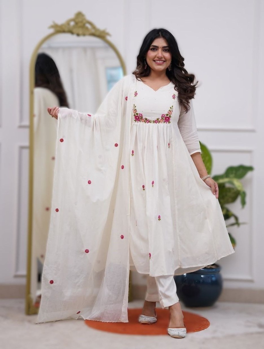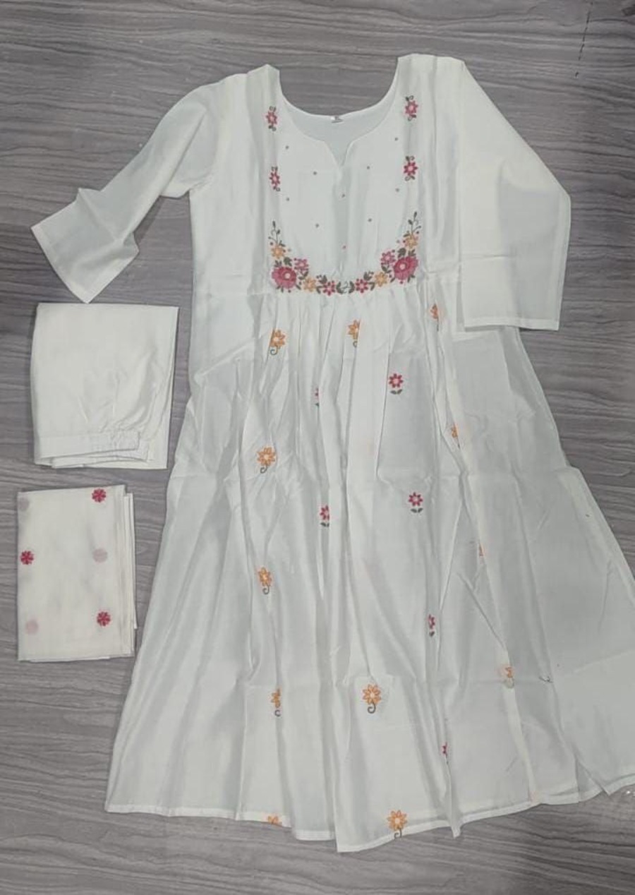RICH LOOK PV CHANDERI EMBROIDERY WORK TOP BOTTOM WITH DUPATTA WHITE