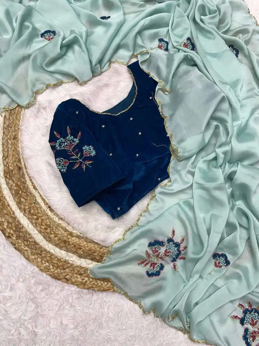 RICH LOOK RANGOLI SILK CUTDANA, MOTI AND RESHAM THREAD WORK SAREE WITH UNSTITCHED BLOUSE SKY