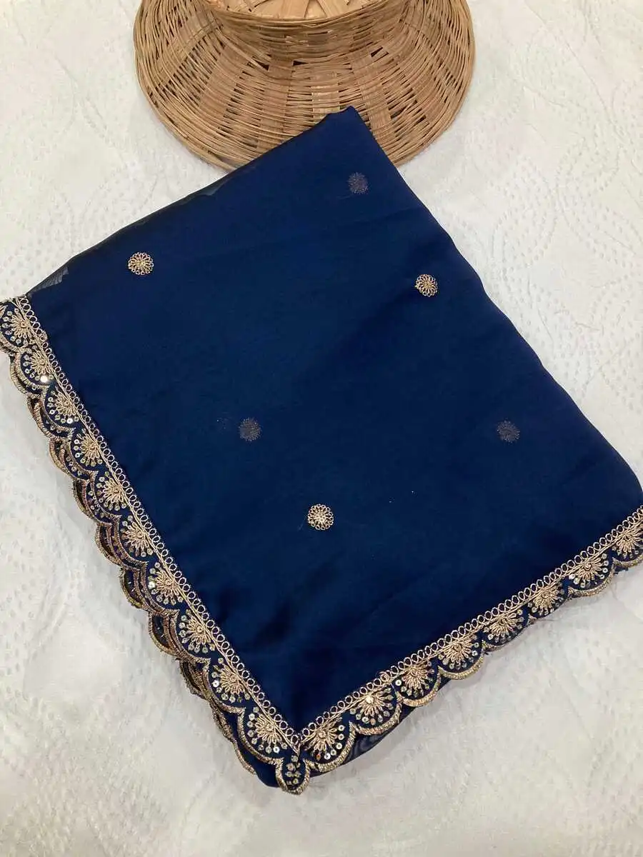 RICH LOOK RANGOLI SILK EMBROIDERY CUTWORK WORK LACE BORDER WORK SAREE WITH UNSTITCHED BLOUSE NAVY BLUE