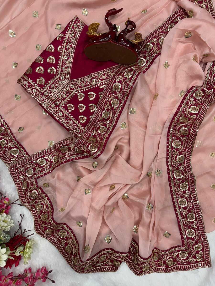 SAREE FABRIC : PREMIUM DIAMOND CHINON SILK WITH HEAVY EMBROIDERY CODING MULTI TREADS AND SEQUENCE WORK