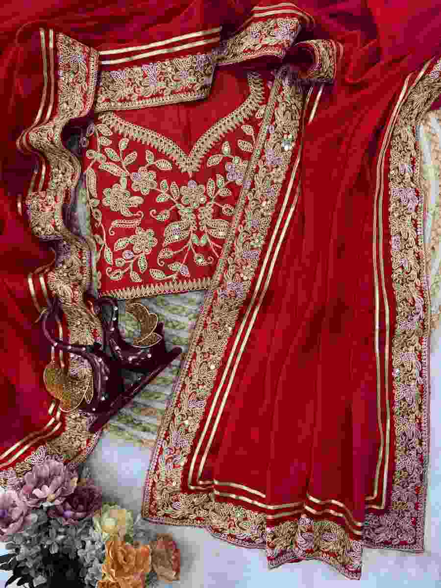 SAREE FABRIC : PURE SOFT JIMMY CHOO WITH HEAVY EMBROIDERY MULTI TREADS , CODING & SEQUENCE WORK & FANCY CUT WORK BORDER