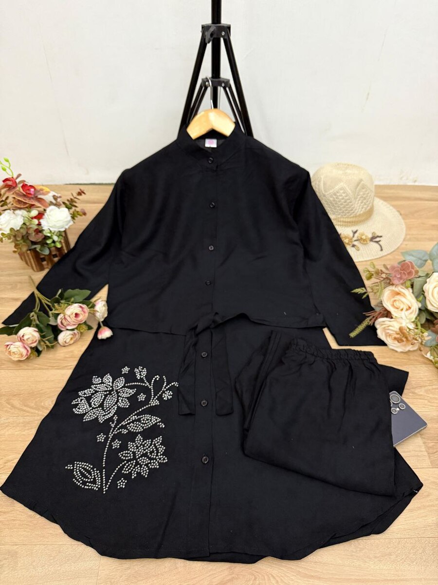 RICH LOOK RAYON DIAMOND WORK WITH FANCY BELT AND KURTI PALAZZO SET BLACK