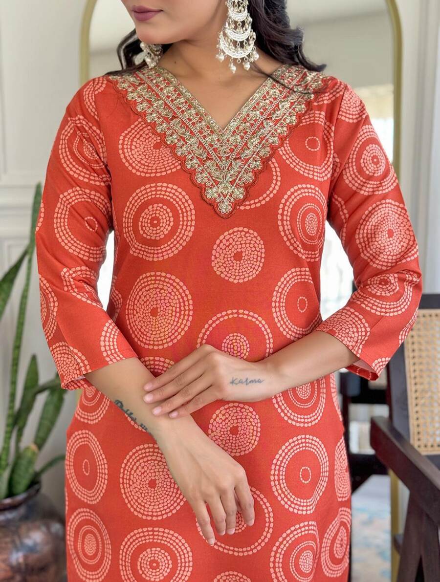 KURTI FABRIC : RAYON BANDHANI PRINTED STRAIGHT KURTI NAYARA CUT