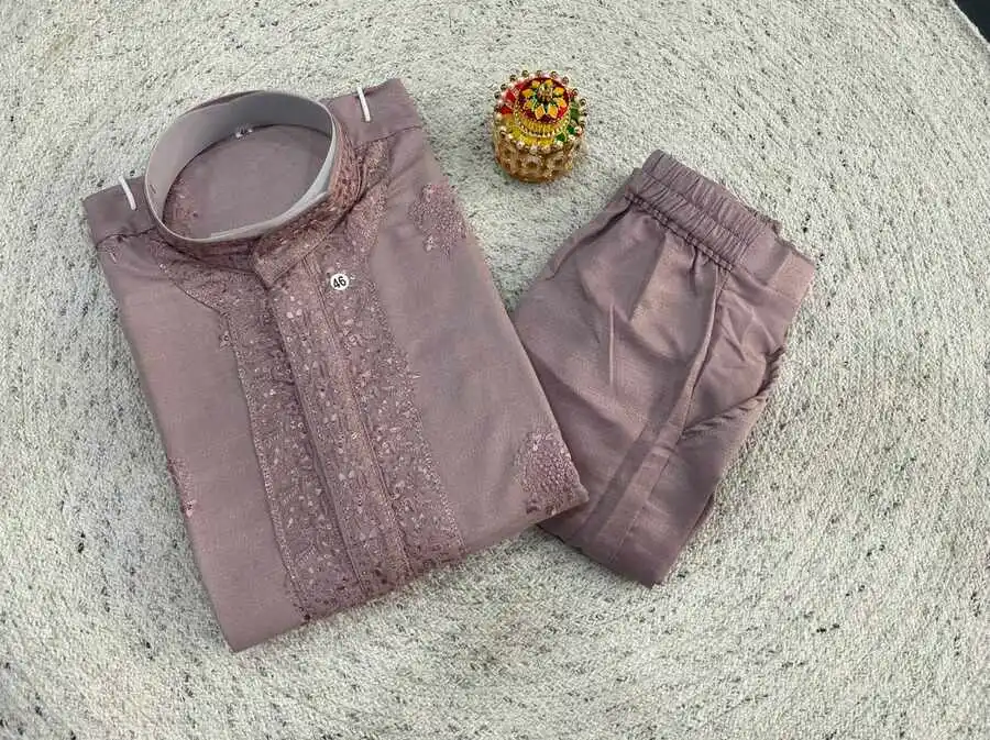 RICH LOOK RAYON SILK EMBROIDERY SEQUENCE WORK MEN’S KURTA PAYJAMA LAVENDER