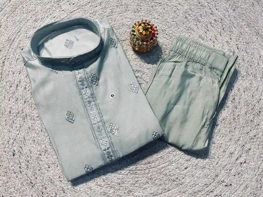 RICH LOOK RAYON SILK EMBROIDERY SEQUENCE WORK MEN’S KURTA PAYJAMA SKY