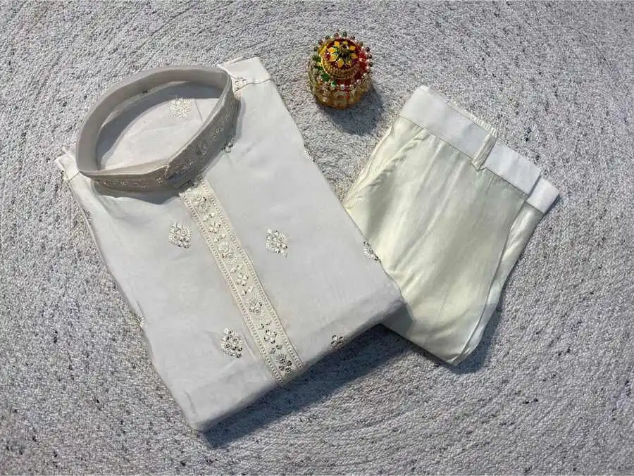 RICH LOOK RAYON SILK EMBROIDERY SEQUENCE WORK MEN’S KURTA PAYJAMA WHITE