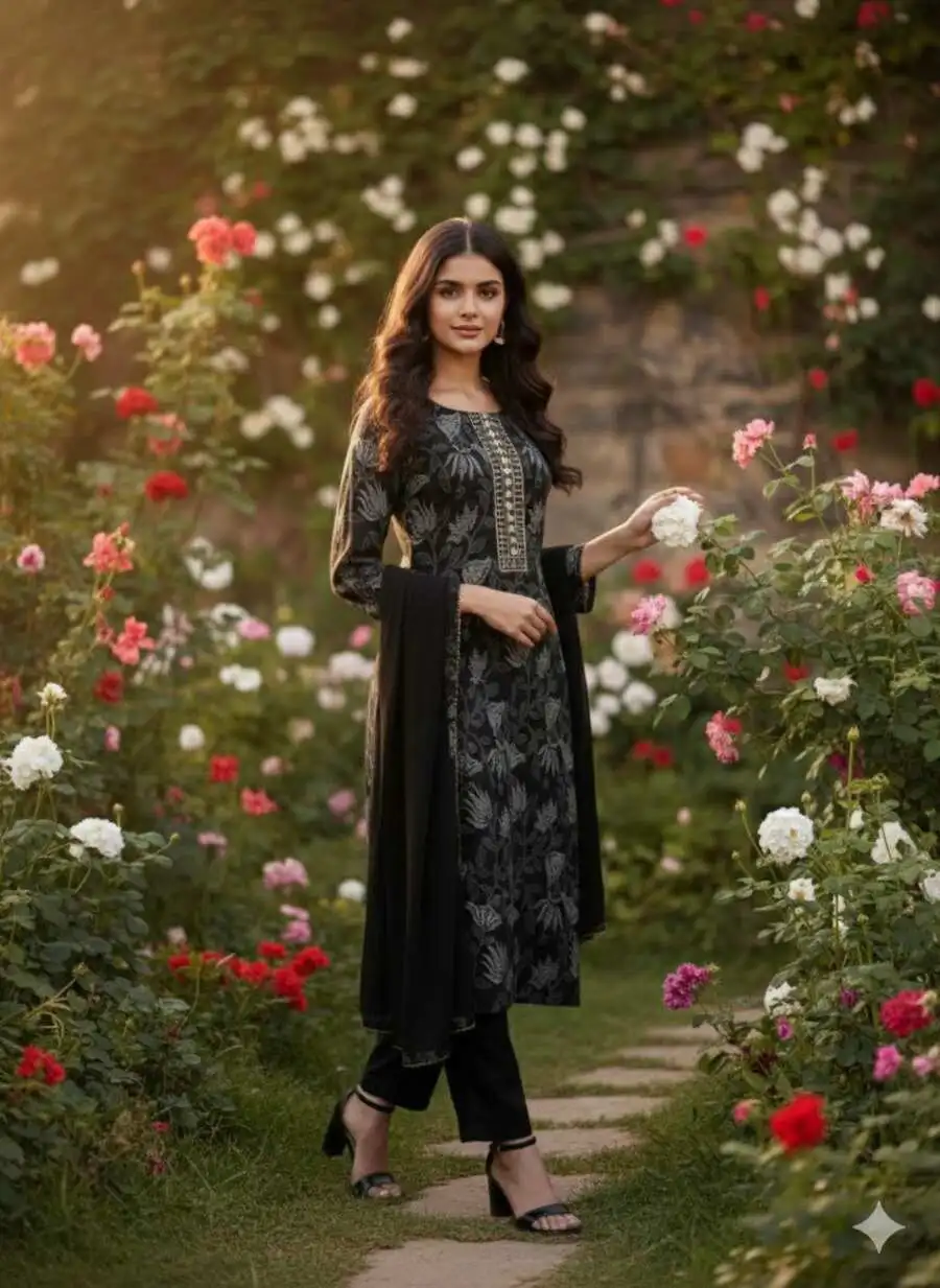 RICH LOOK RAYON SLUB DIGITAL PRINTED TOP BOTTOM WITH DUPATTA BLACK