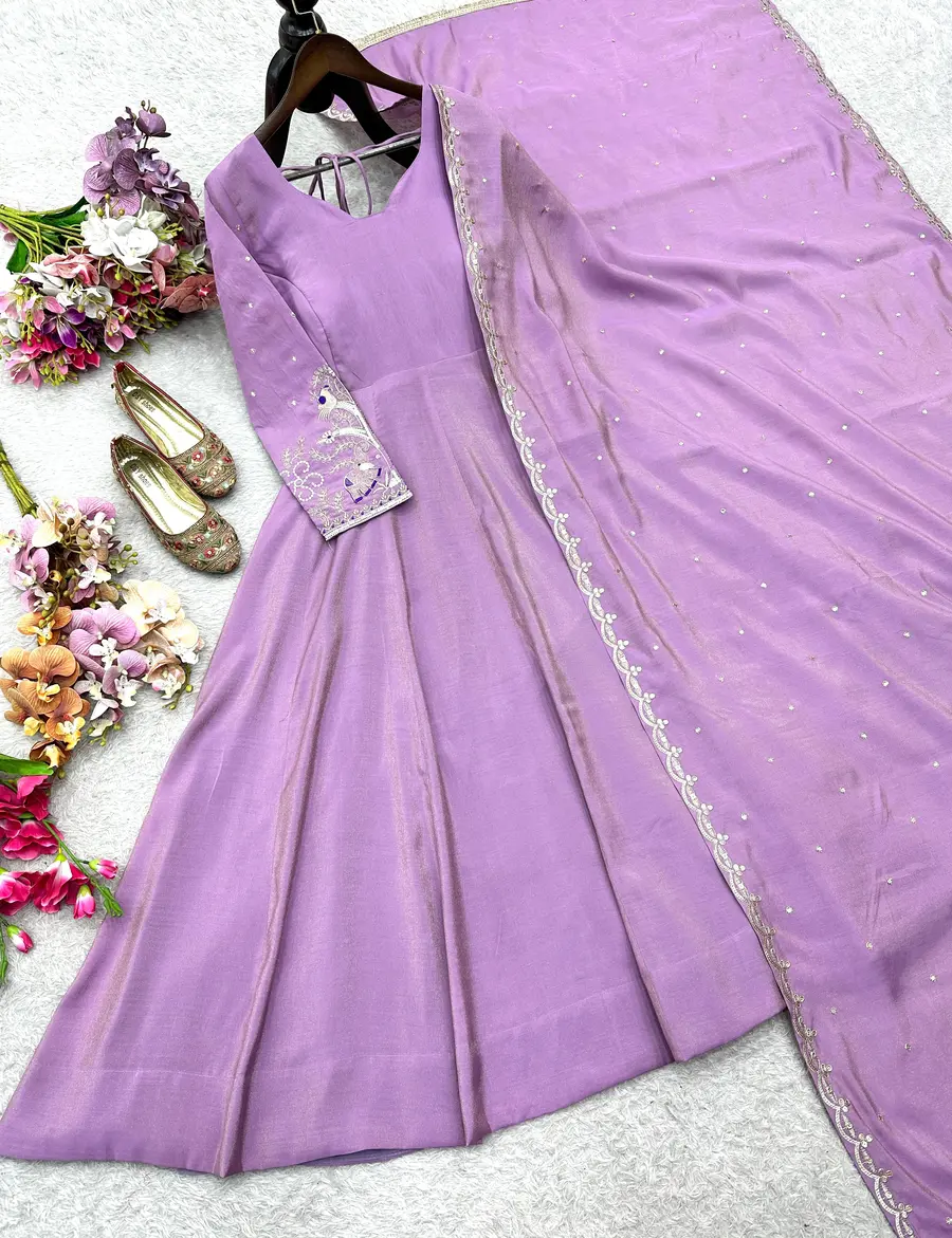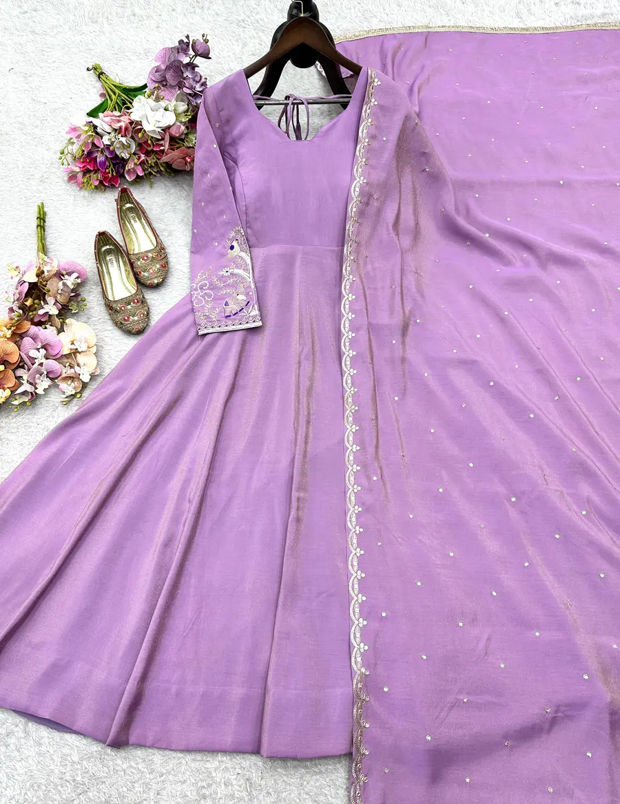 RICH LOOK ROMAN SHIMMER SILK EMBROIDERY 5 MM SEQUENCE WORK GOWN WITH DUPATTA LAVENDER