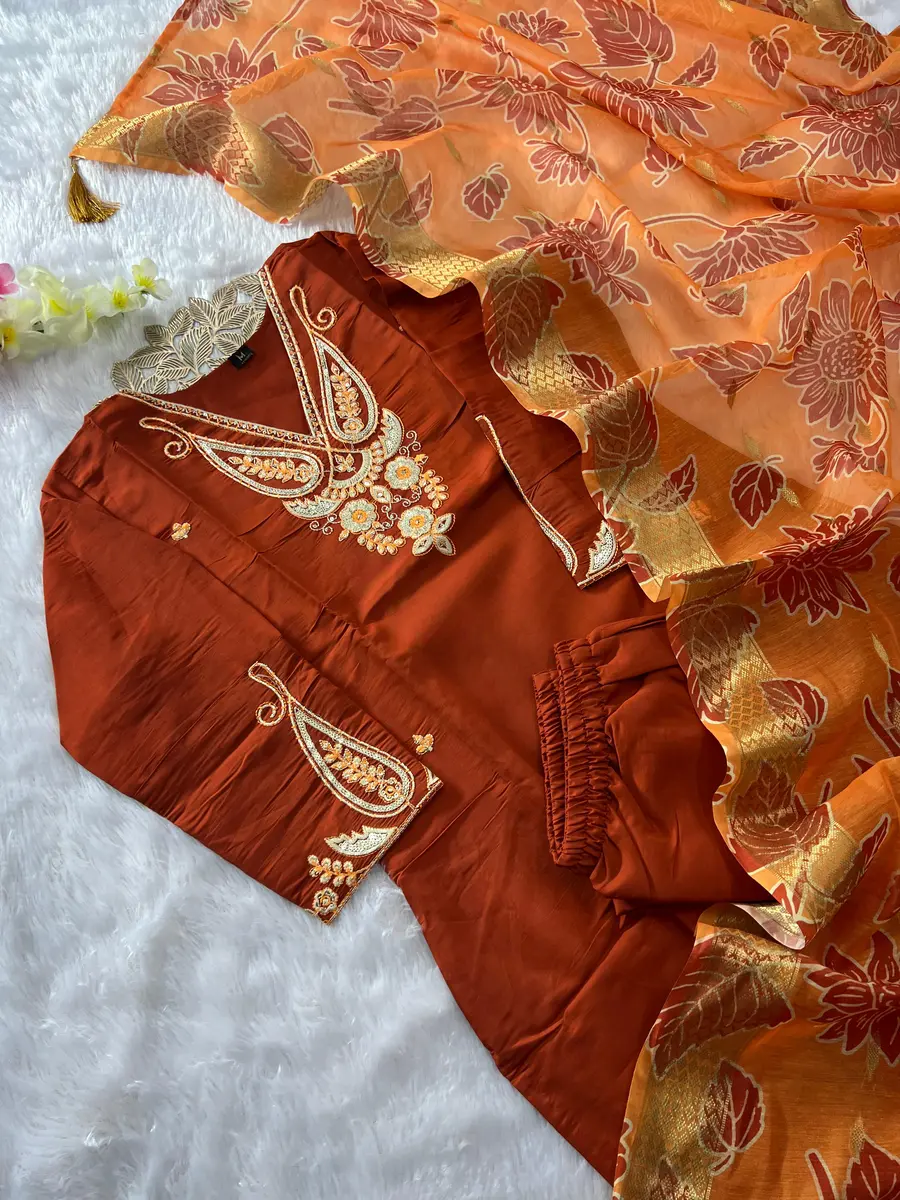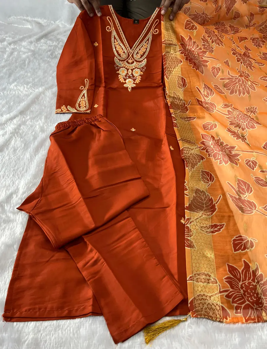 RICH LOOK ROMAN SILK EMBROIDERY WITH SEQUENCE WORK TOP BOTTOM WITH DUPATTA ORANGE