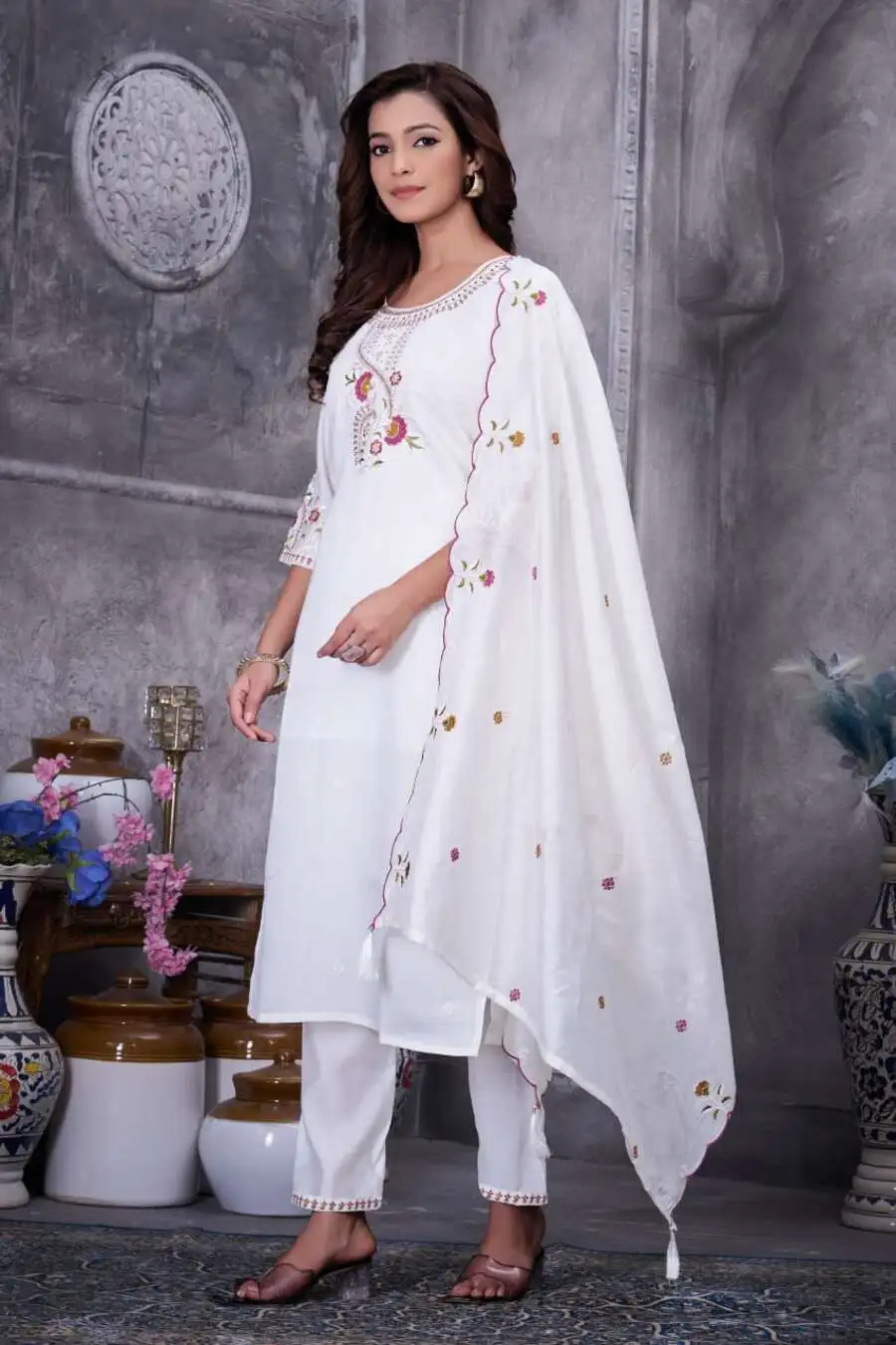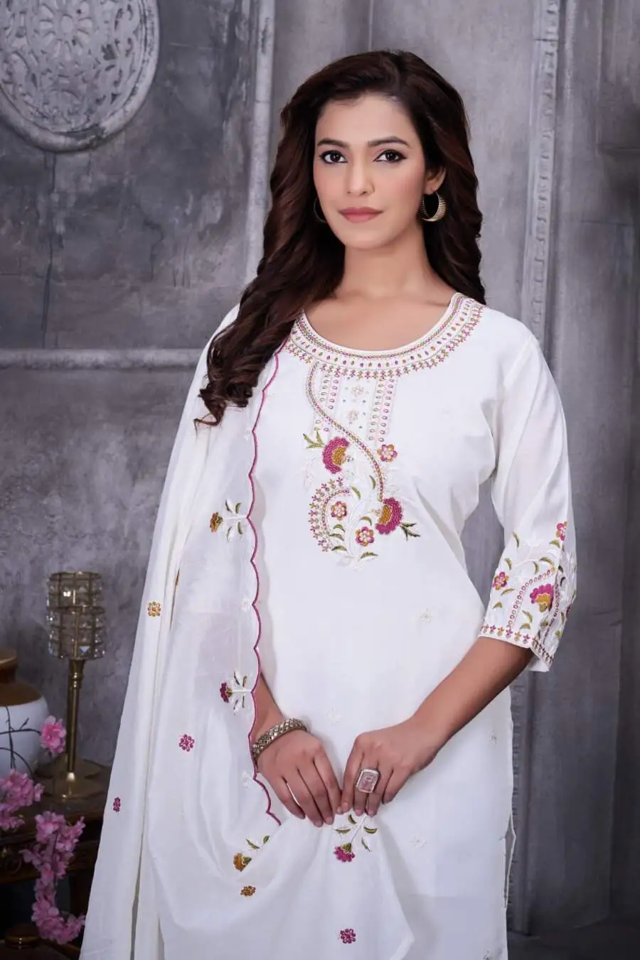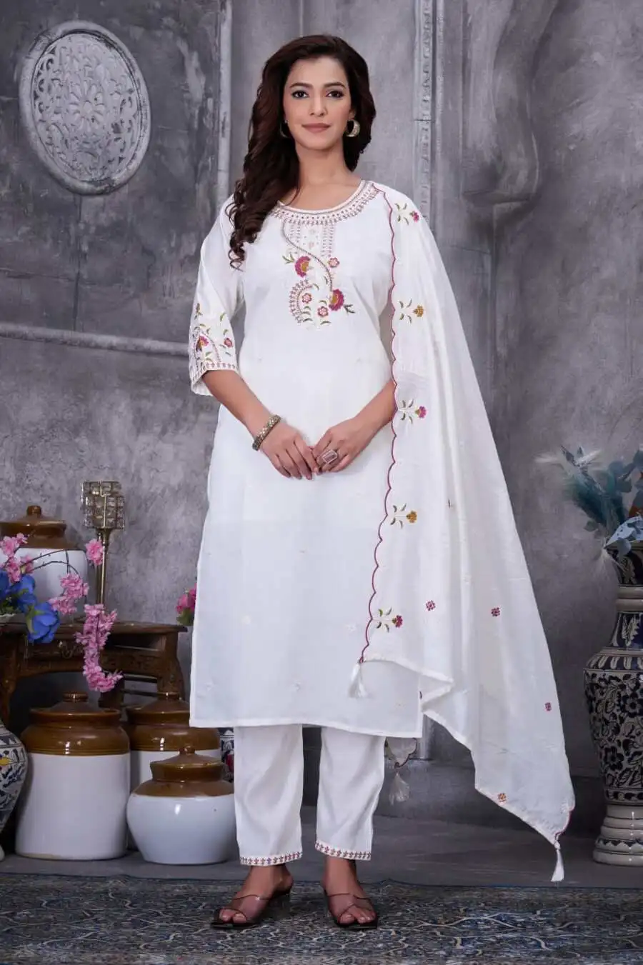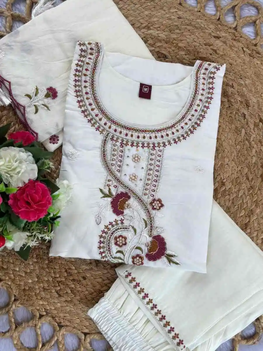 RICH LOOK ROMAN SILK MULTI EMBROIDERY THREAD WITH HAND WORK TOP BOTTOM WITH DUPATTA WHITE