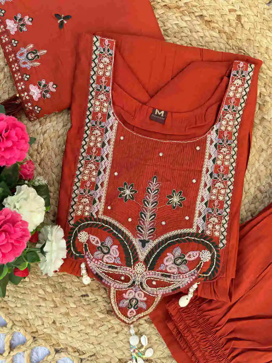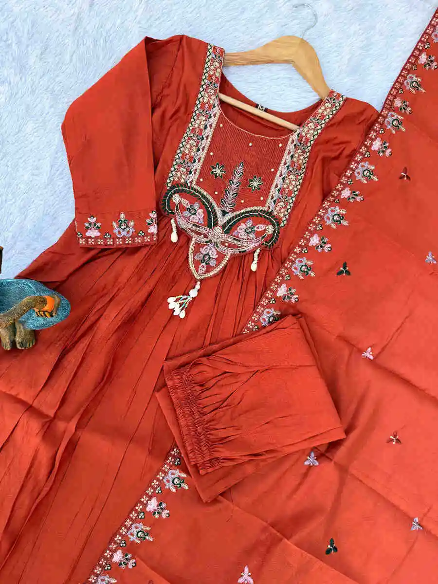 RICH LOOK ROMAN SILK MULTI-THREAD & SEQUENCE EMBROIDERY WITH HANDWORK TOP BOTTOM WITH DUPATTA ORANGE