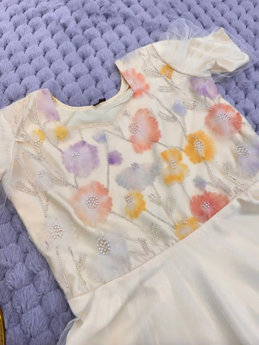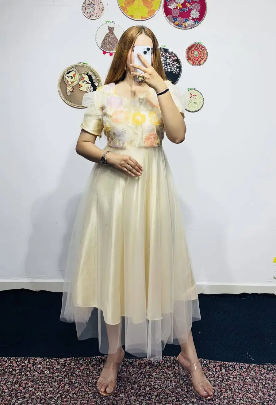 RICH LOOK SATIN BEADS AND NET WORK ONE PIECE DRESS YELLOW