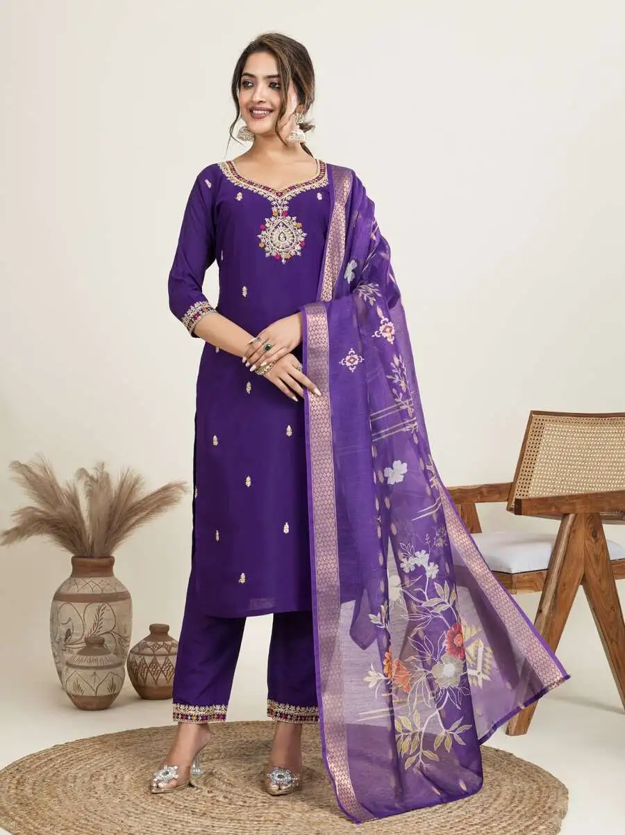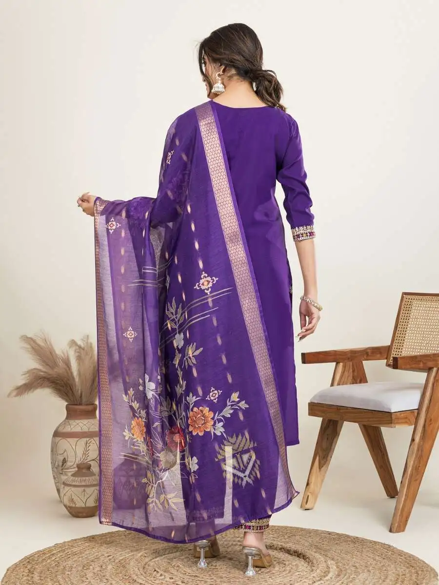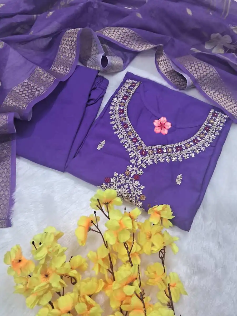 RICH LOOK SLUB COTTON EMBROIDERY SEQUENCE WORK TOP BOTTOM WITH DUPATTA PURPLE