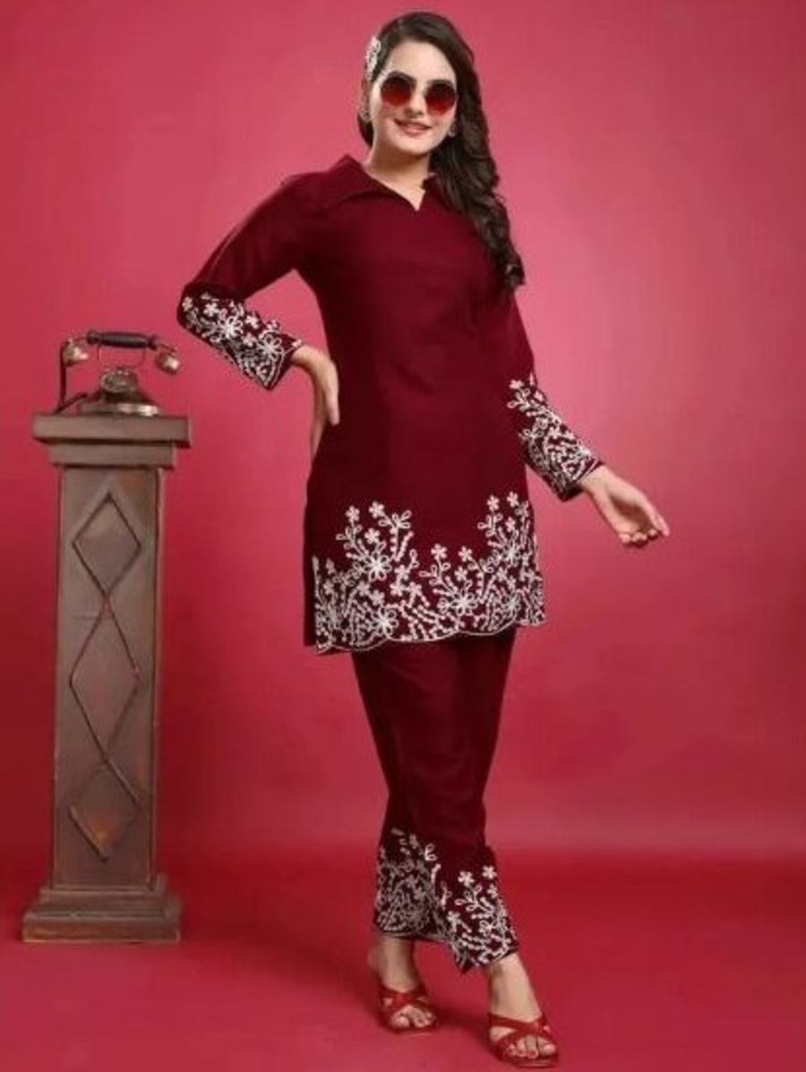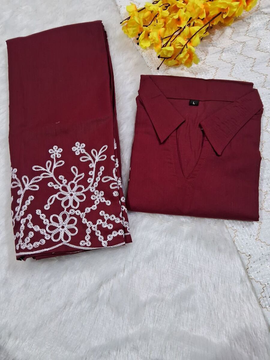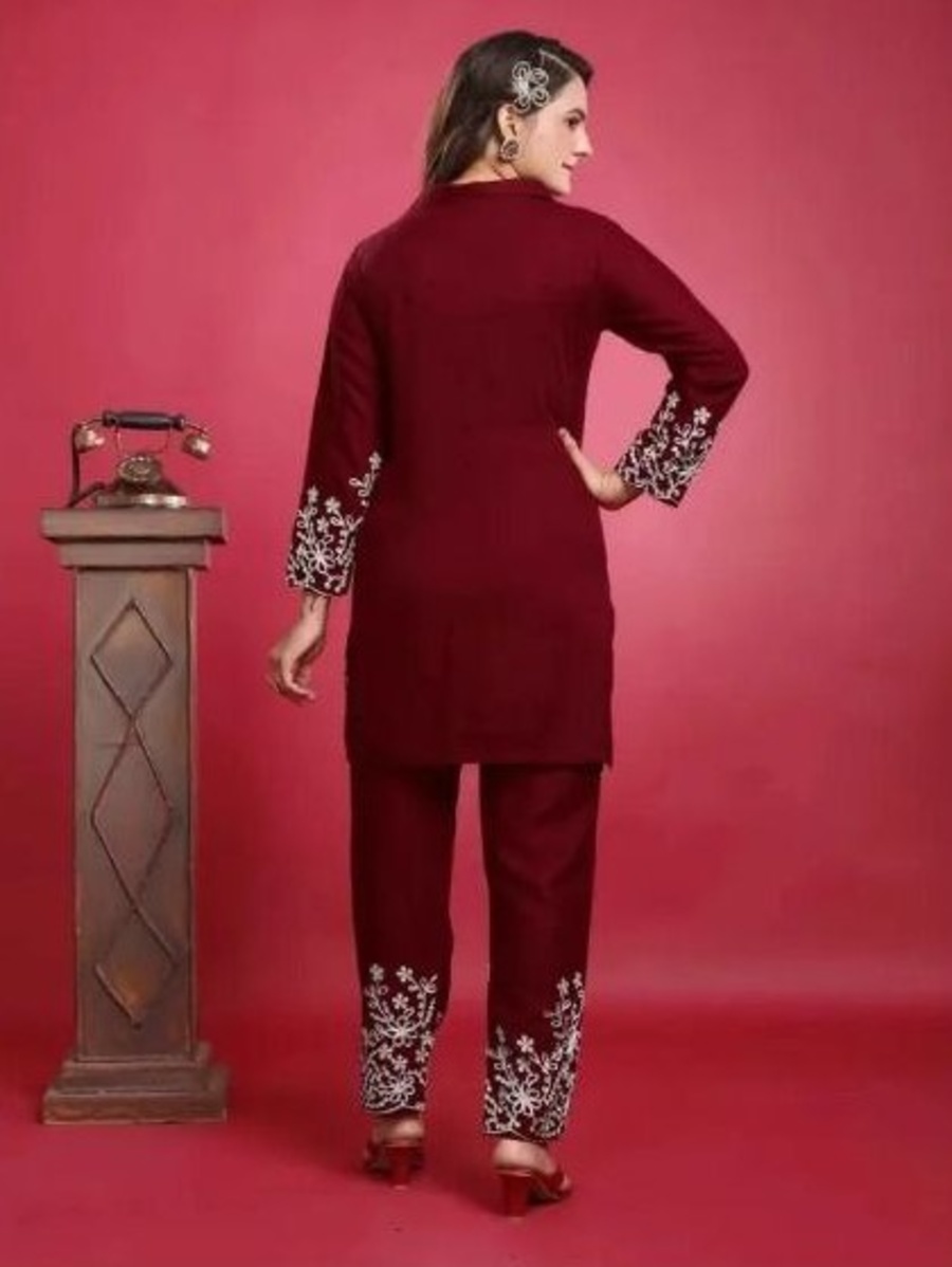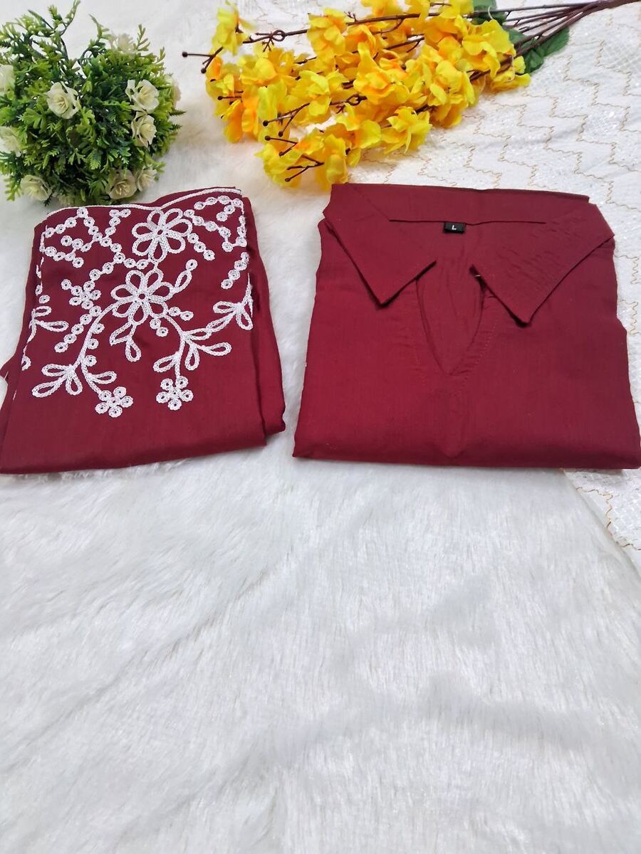 RICH LOOK SLUB COTTON EMBROIDERY WORK CO-ORD SET MAROON