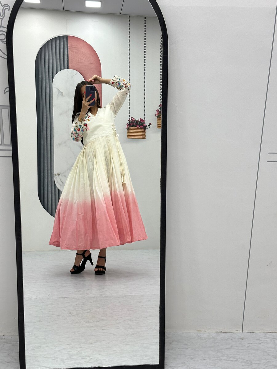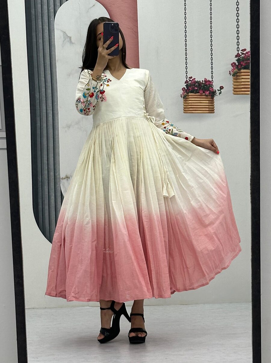 RICH LOOK SOFT COTTON THREAD EMBROIDERY WORK ONE PIECE DRESS PEACH