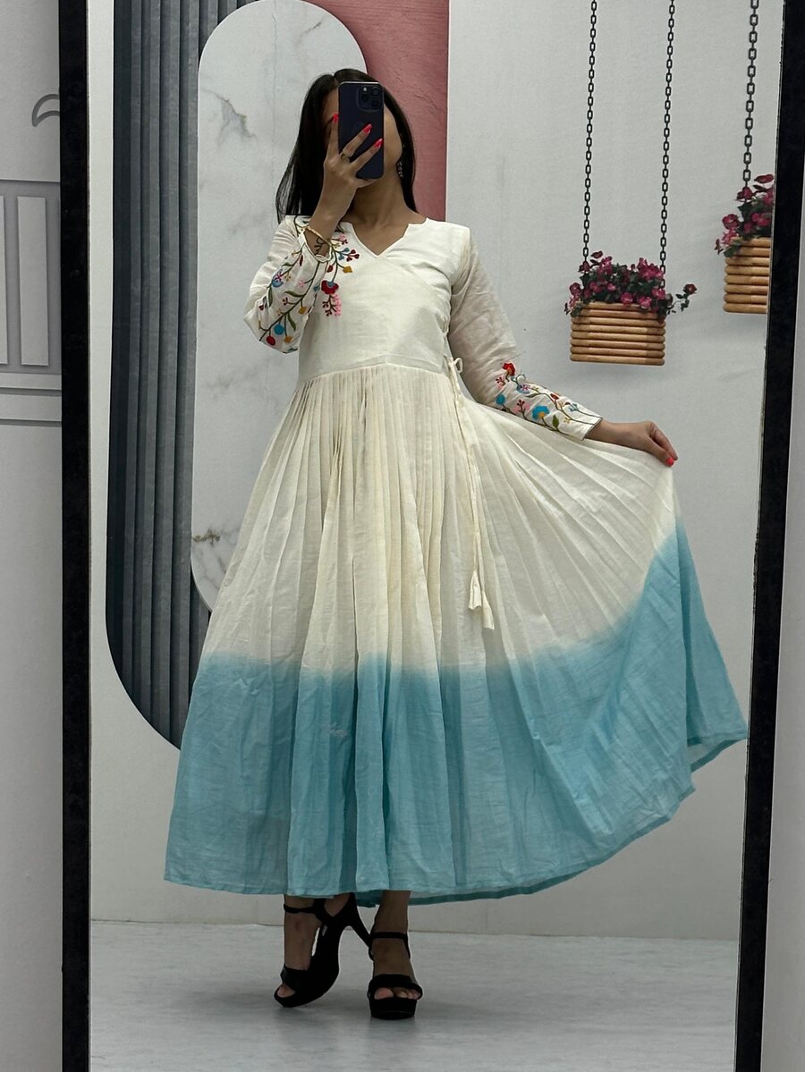 RICH LOOK SOFT COTTON THREAD EMBROIDERY WORK ONE PIECE DRESS SKY