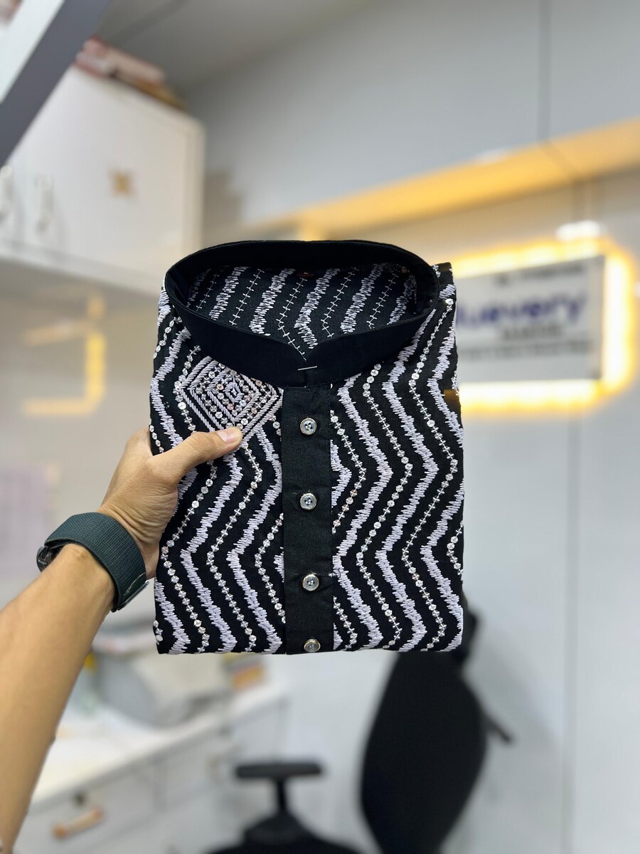 RICH LOOK SOFT SILK CROSS PATTERN WHITE THREAD EMBROIDERY SEQUENCE WORK MEN’S KURTA PAYJAMA BLACK