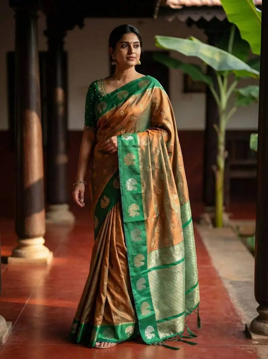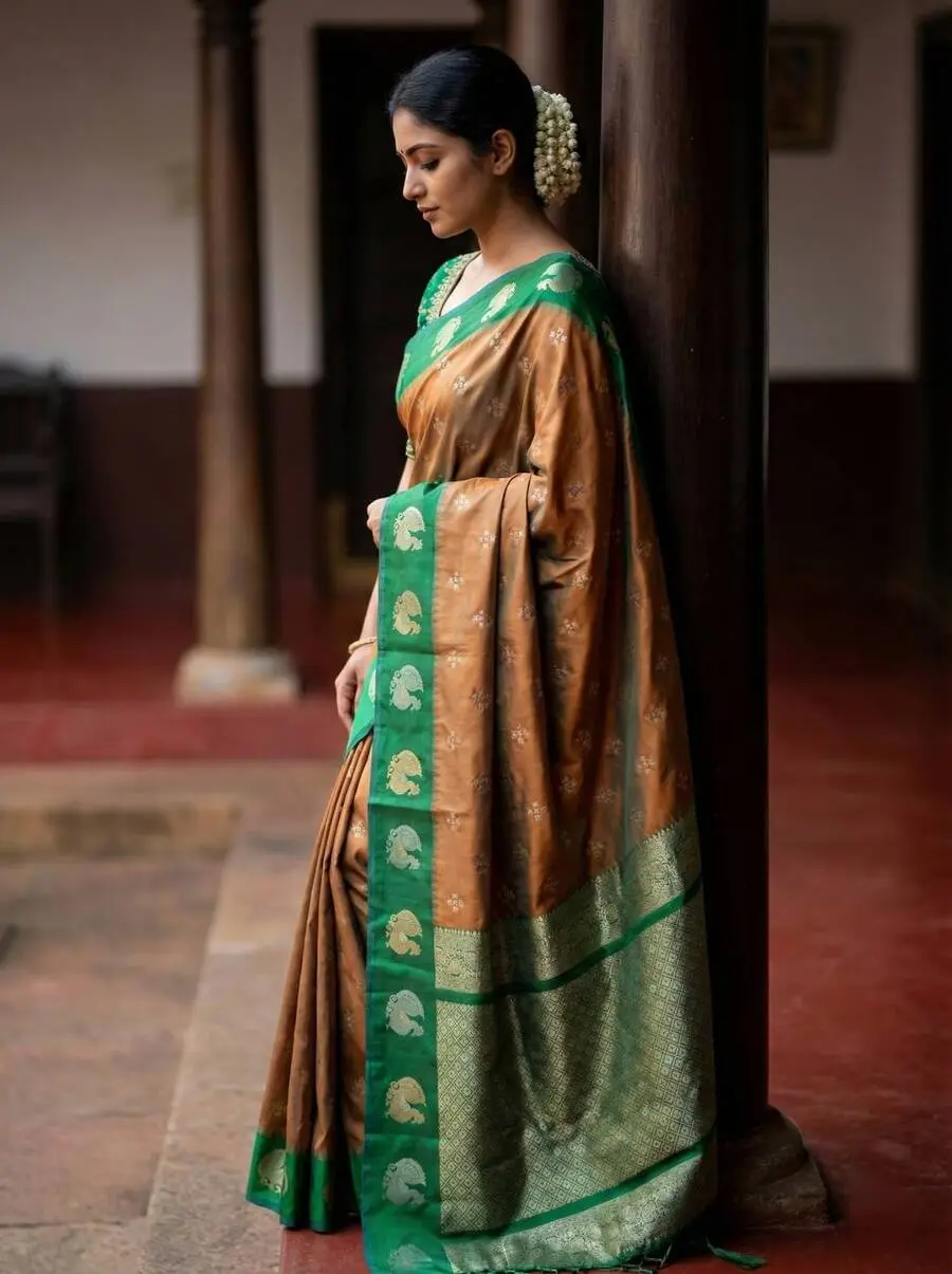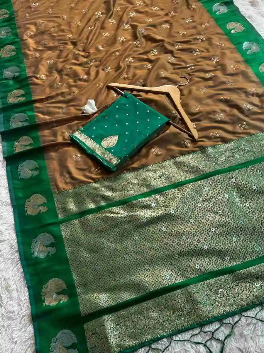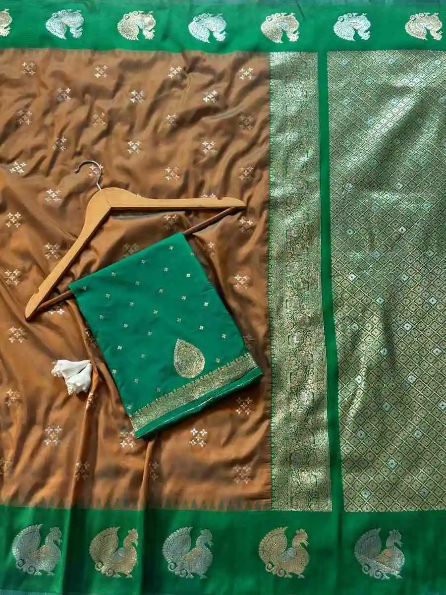 RICH LOOK SOFT SILK ZARI WORK COPPER & SILVER FANCY BUTTI WITH SATIN BORDER WORK SAREE WITH UNSTITCHED BLOUSE CHIKU AND GREEN