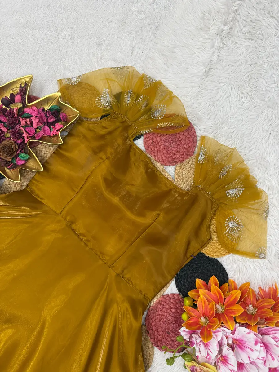 RICH LOOK SPACE SILK & NET THREAD EMBROIDERY WORK GOWN MUSTARD