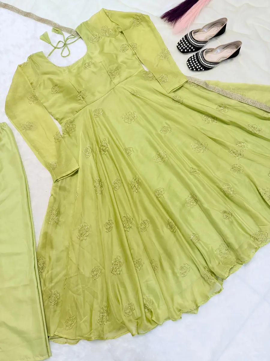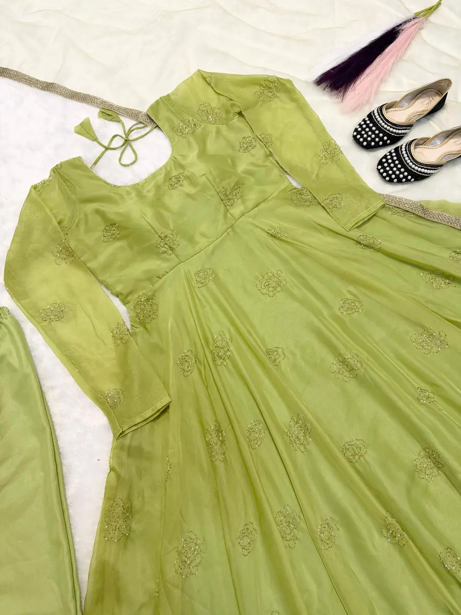 RICH LOOK TABBY ORGANZA BEADS HAND WORK AND EMBROIDERY WORK ANARKALI BOTTOM WITH DUPATTA GREEN