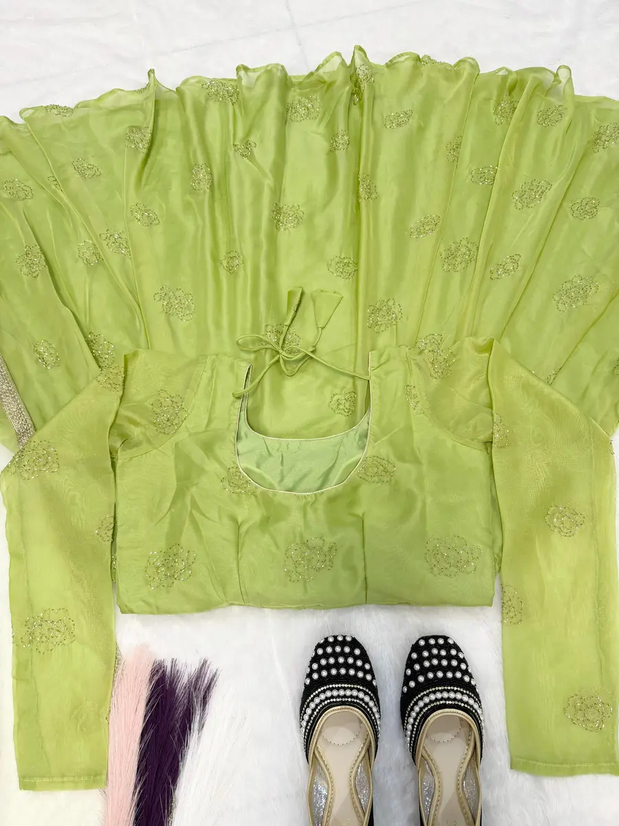 FABRIC : PURE CHINON SILK WITH EMBROIDERY 5MM SEQUENCE WORK WITH SLEEVE WITH TASSELS