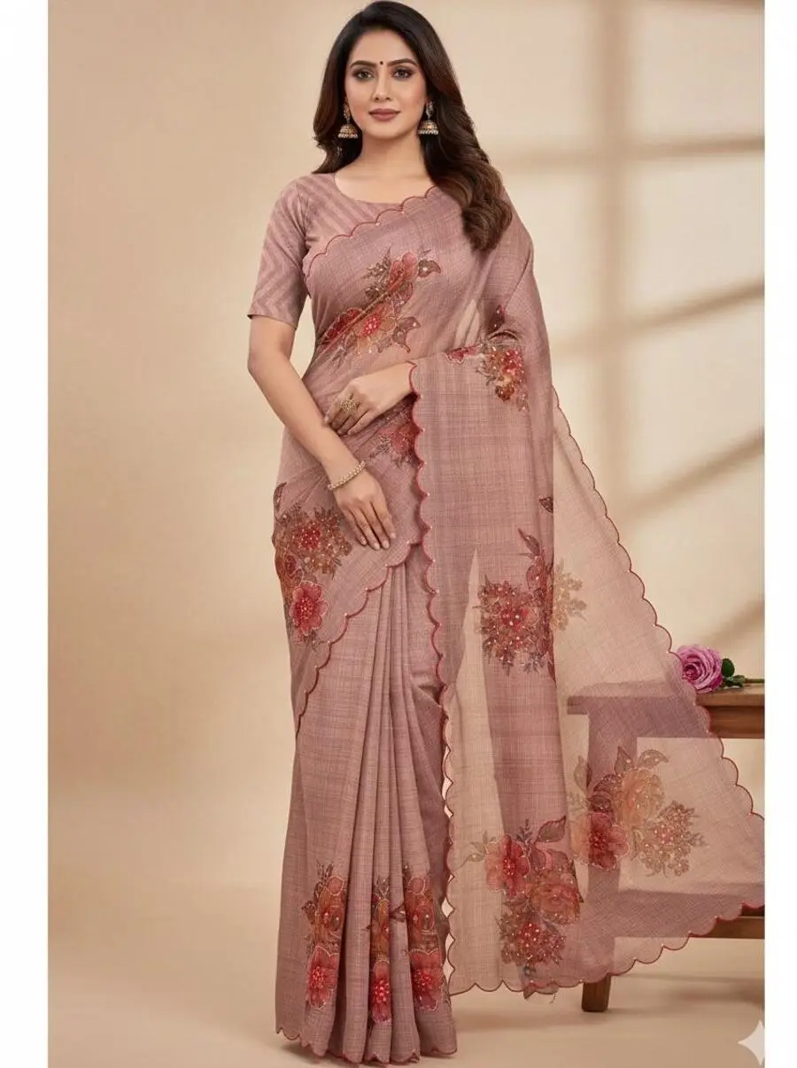 RICH LOOK TABBY ORGANZA DIGITAL PRINT AND KHATLI WORK SAREE WITH UNSTITCHED BLOUSE PEACH