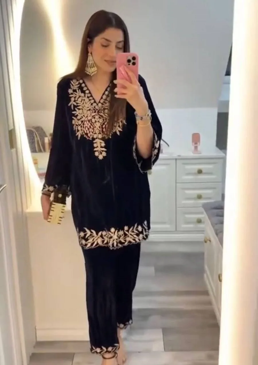 RICH LOOK VELVET SEQUENCE EMBROIDERY WORK TOP PALAZZO SET BLACK