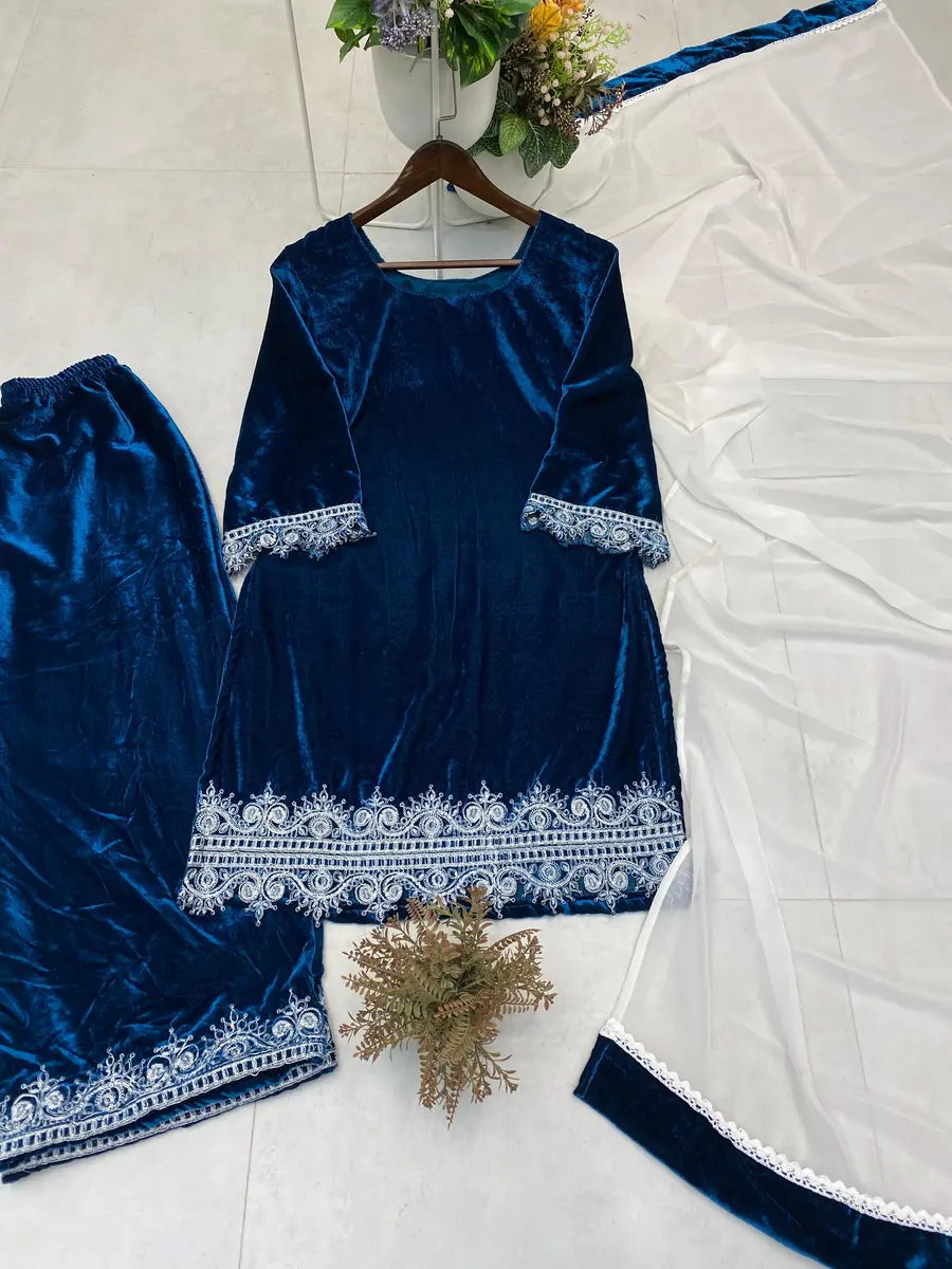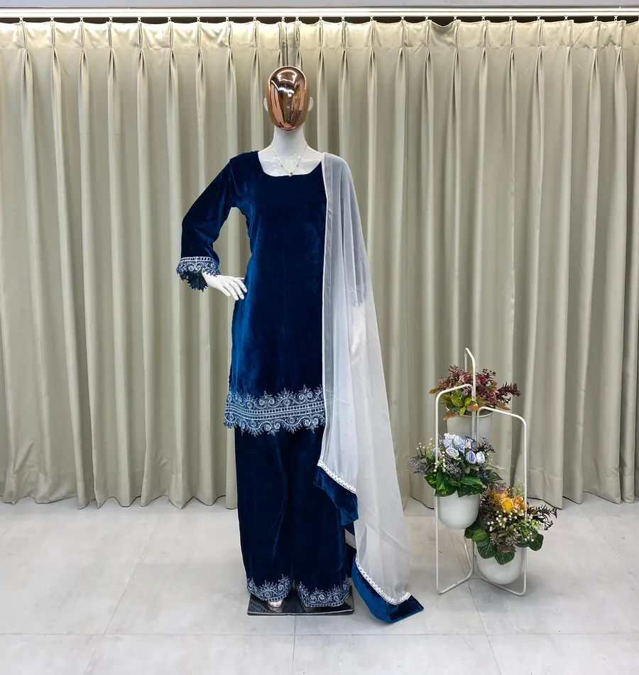 RICH LOOK VELVET SEQUENCE EMBROIDERY WORK TOP PALAZZO WITH DUPATTA BLUE