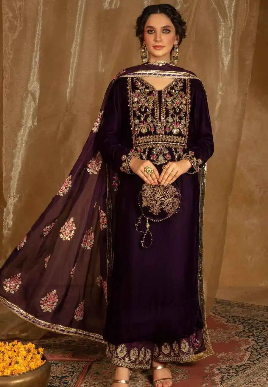 RICH LOOK VELVET SEQUENCE & ZARI EMBROIDERY WORK TOP PALAZZO WITH DUPATTA PURPLE
