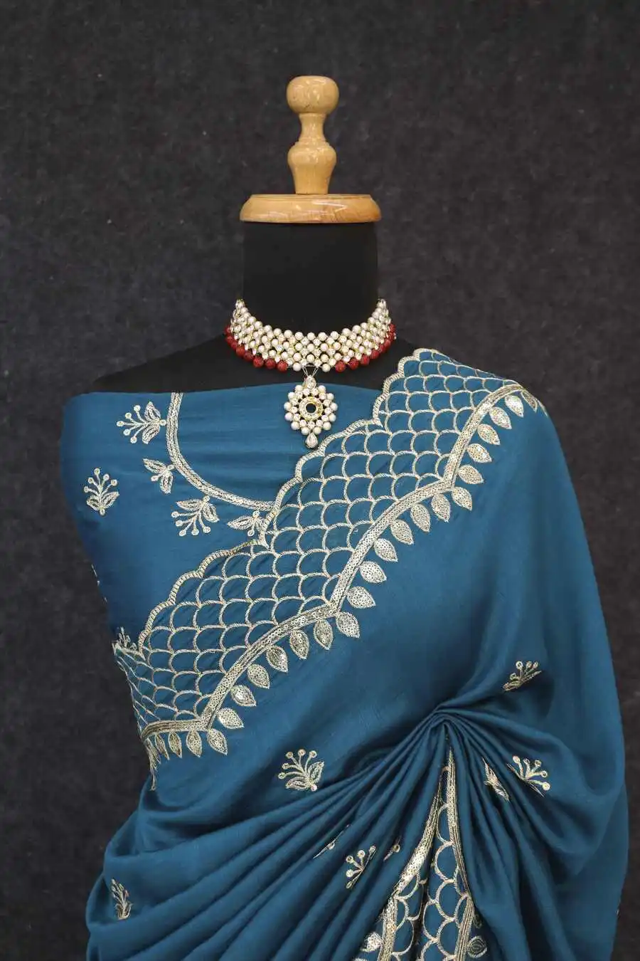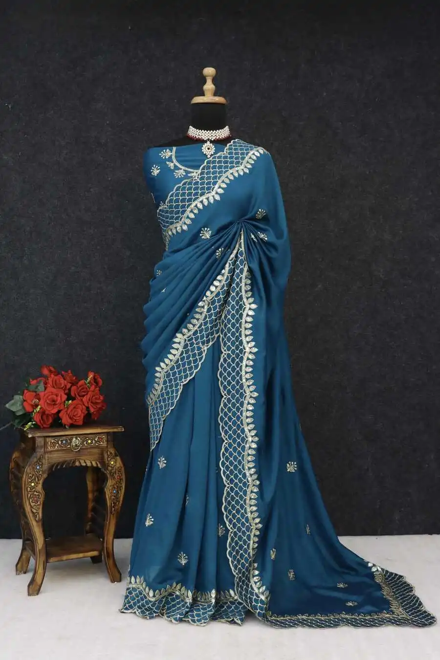 RICH LOOK VICHITRA SILK SEQUENCE THREAD EMBROIEDRY WORK SAREE WITH UNSTITCHED BLOUSE TEAL