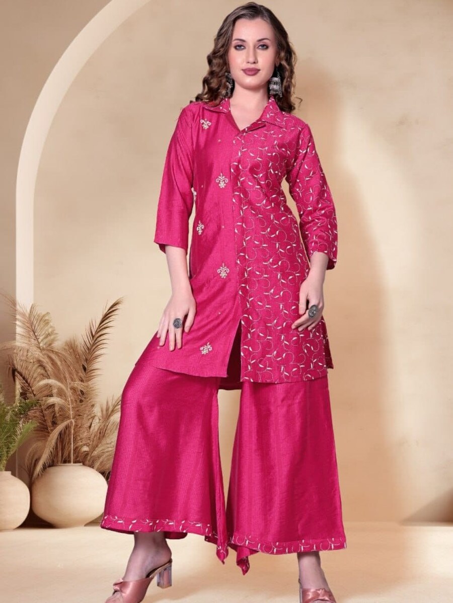 RICH LOOK VISCOSE EMBROIDERY WORK KURTI PALAZZO SET PINK