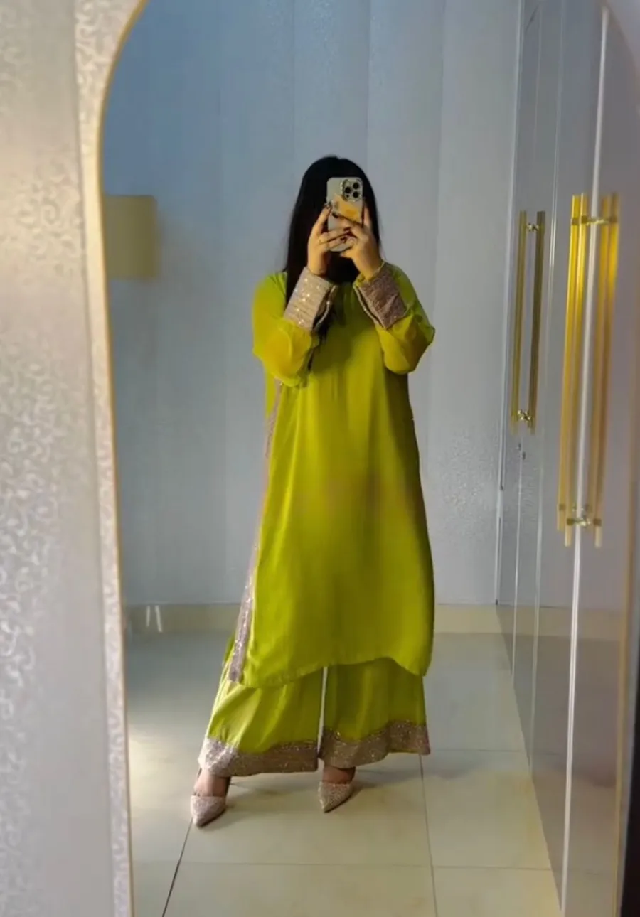 THRENDING GEORGETTE EMBROIDERY SEQUENCE WORK TOP PALAZZO WITH DUPATTA PARROT GREEN