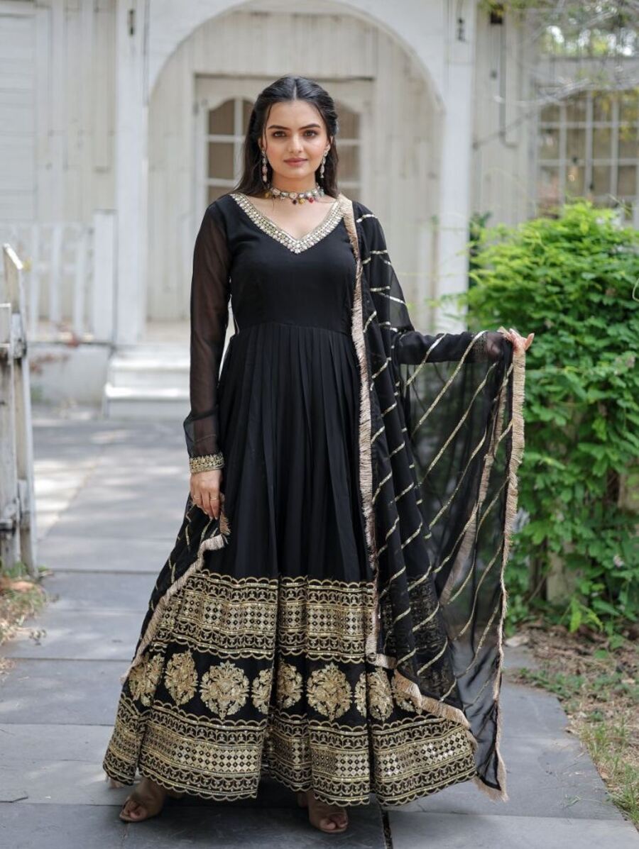 TRADITIONAL BLOOMING GEORGETTE EMBROIDERY SEQUENCE WORK GOWN WITH DUPATTA BLACK