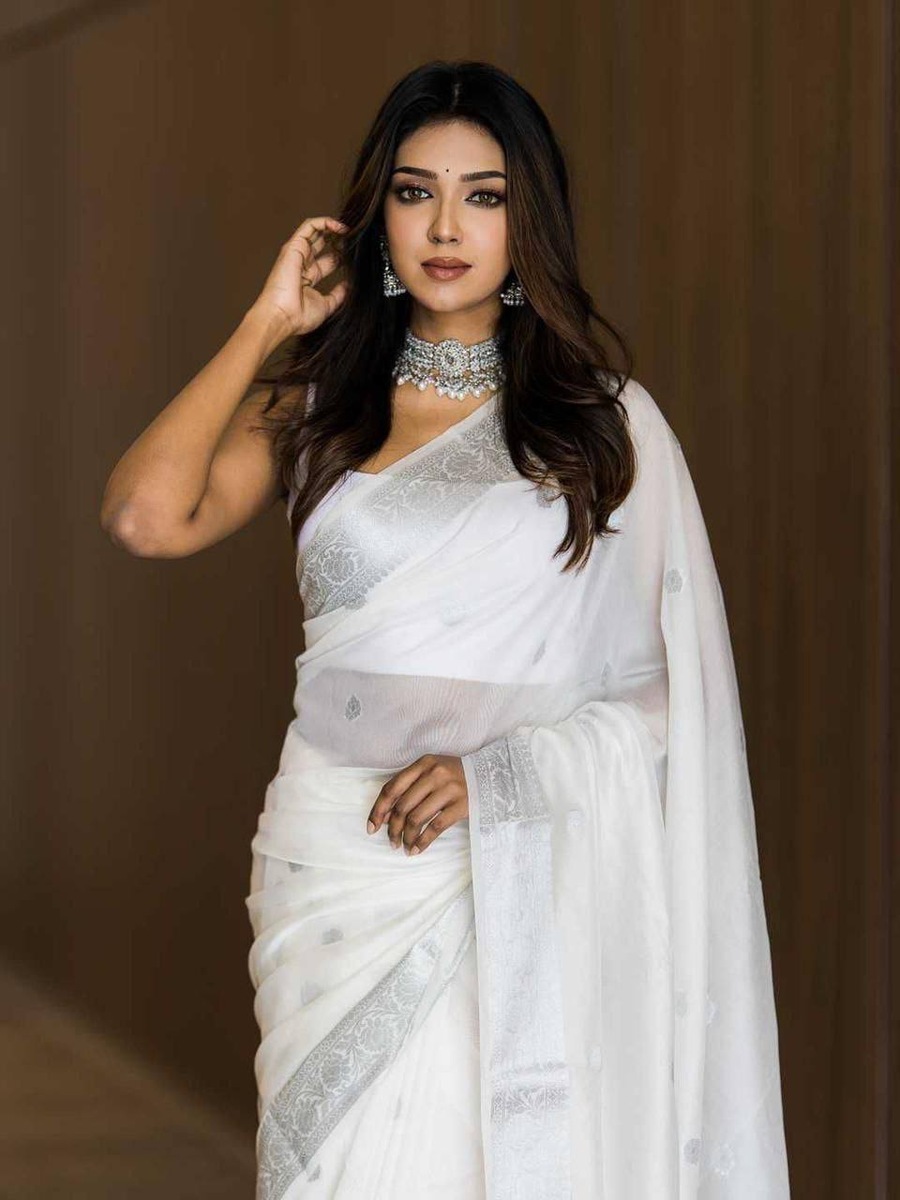 TRADITIONAL LINEN ZARI WEAVING WORK SAREE WITH UNSTITCHED BLOUSE WHITE